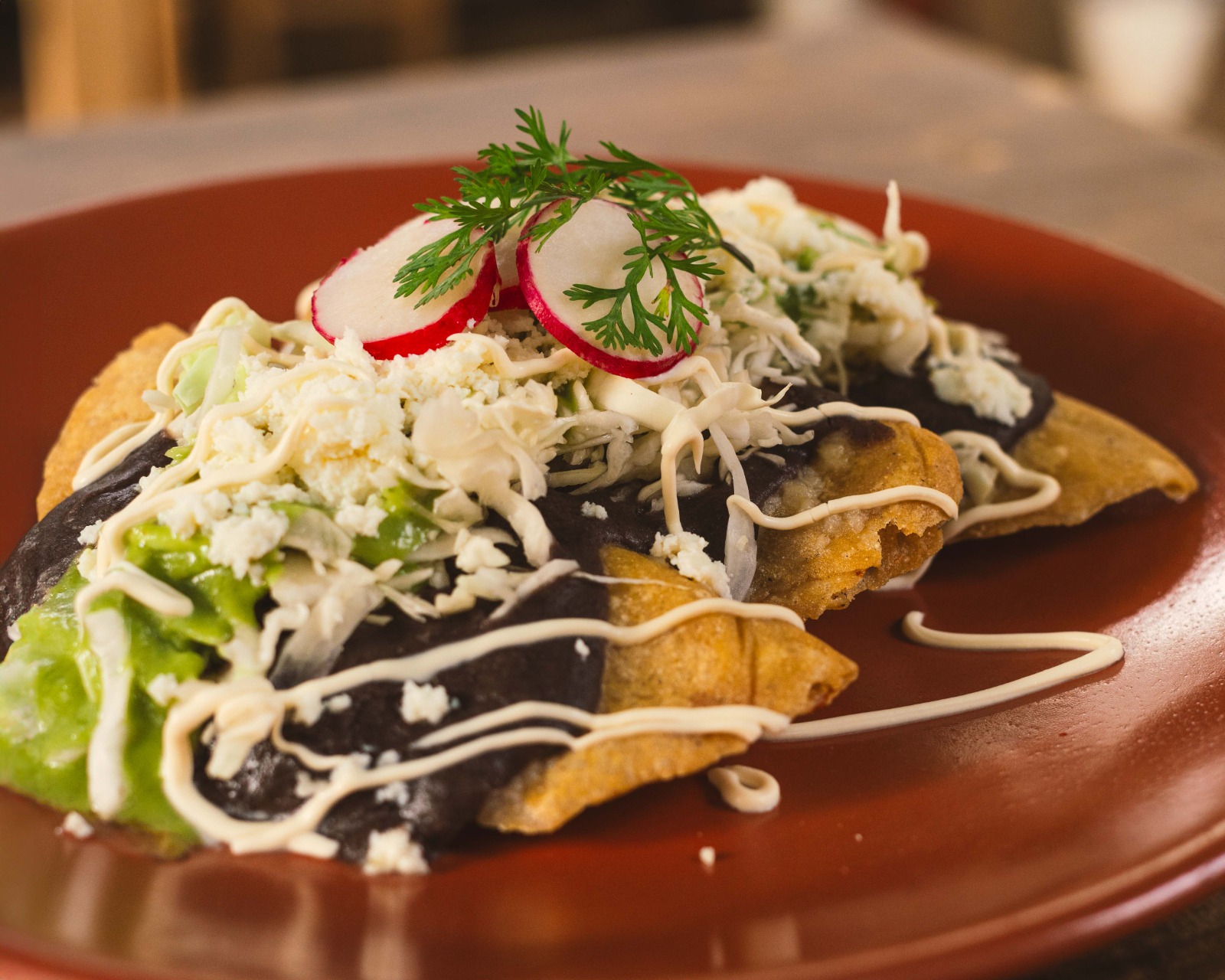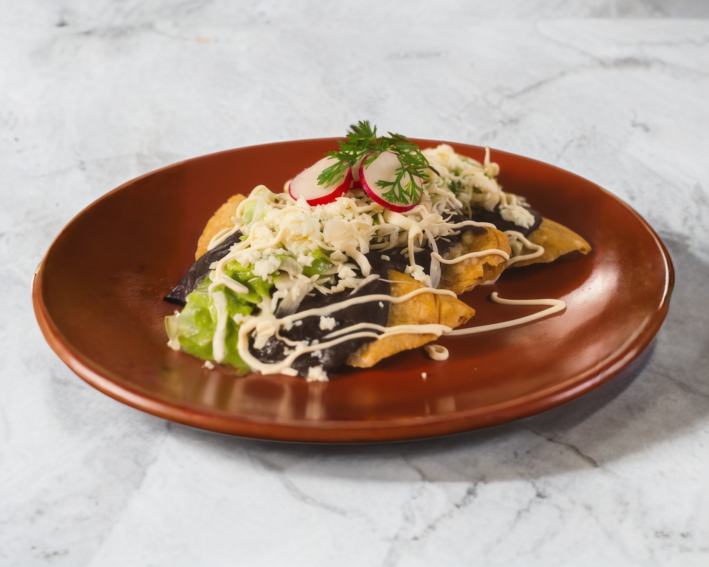 3 Quesadillas fritas rellenas de tinga de pollo, bañadas con pasta de frijol, col, guacamole, queso y crema