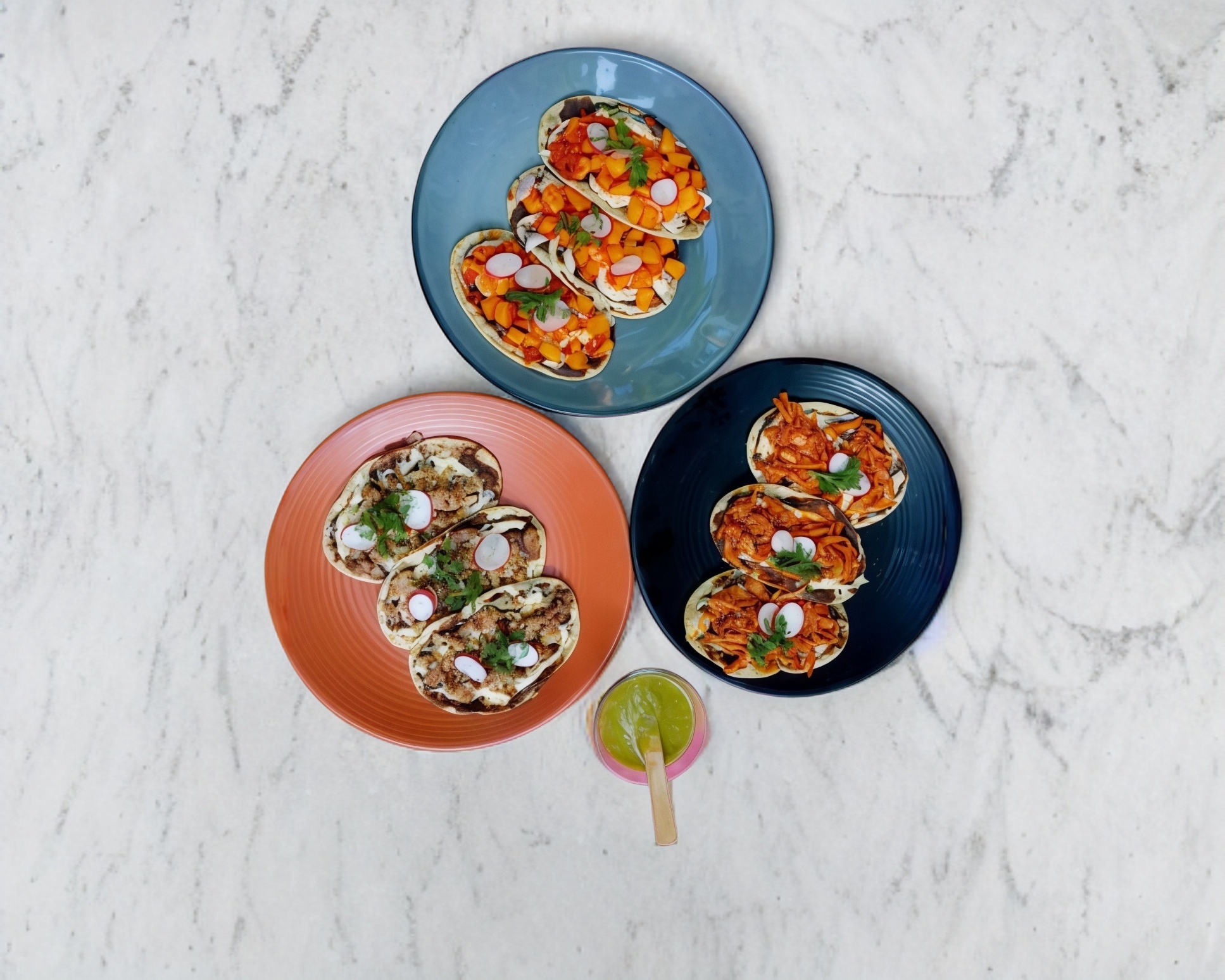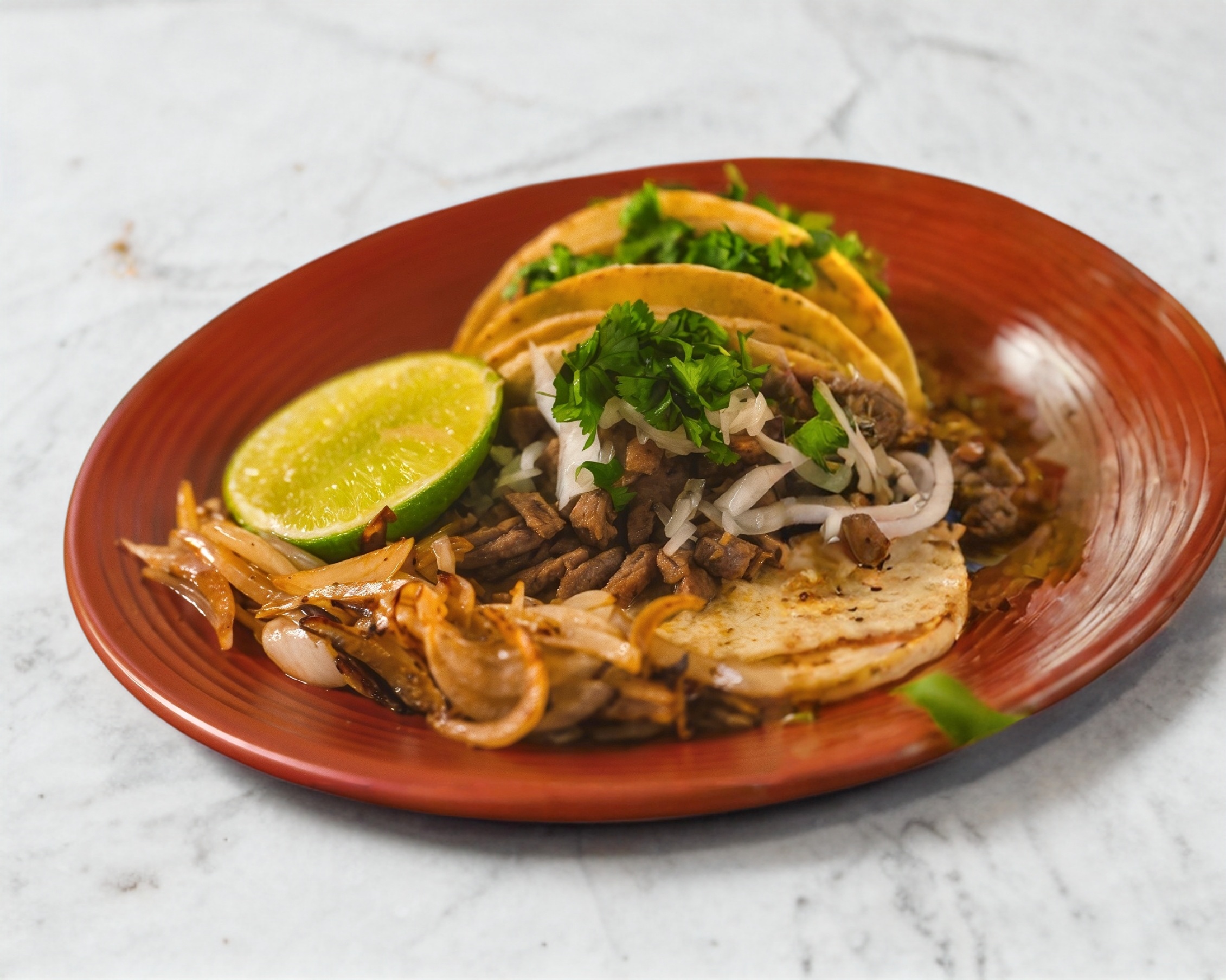 3 Tacos blandos con carne de tasajo frito, cebolla caramelizada, cilantro y limón