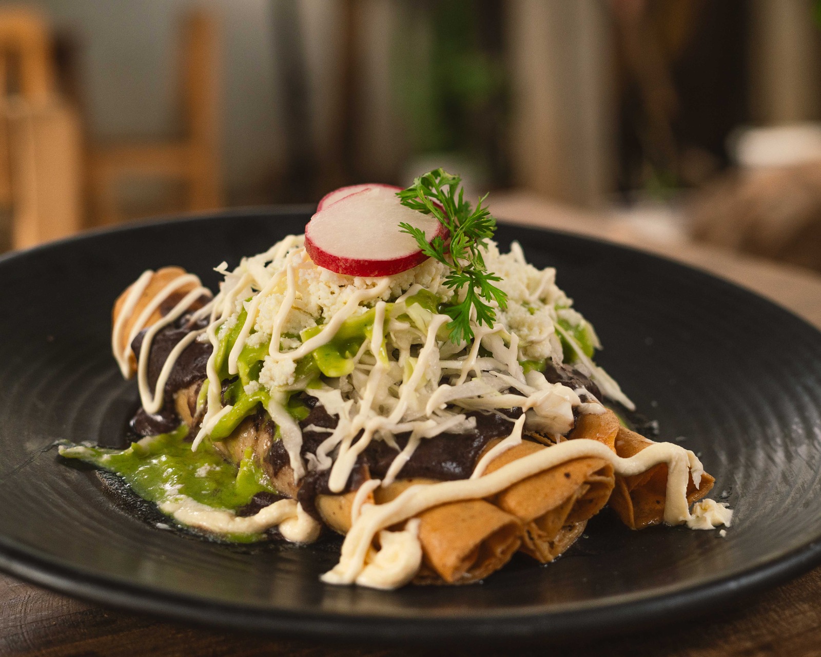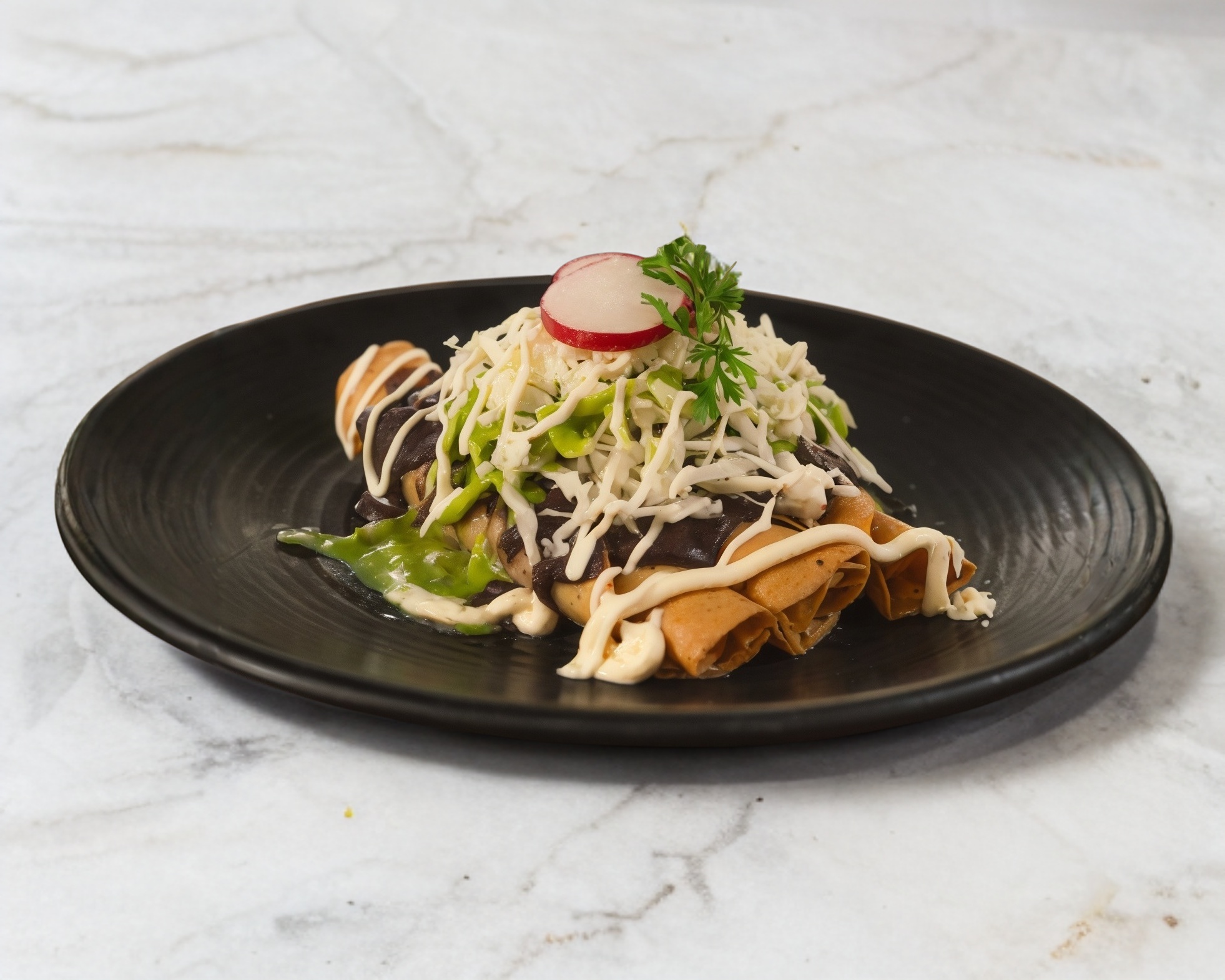 3 Tacos dorados rellenos de quesillo, bañados con pasta de frijol, col, guacamole, queso y crema