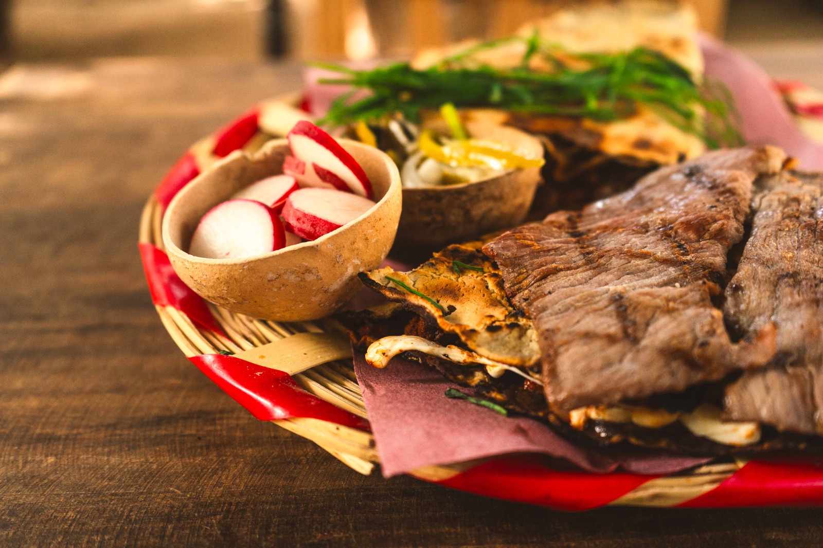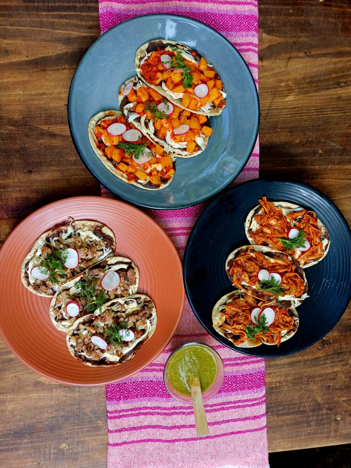 3 Garnachitas istmeñas, tortilla de maíz con falda de res, salsa de chipotle, col encurtida en vinagre, queso seco istmeño.