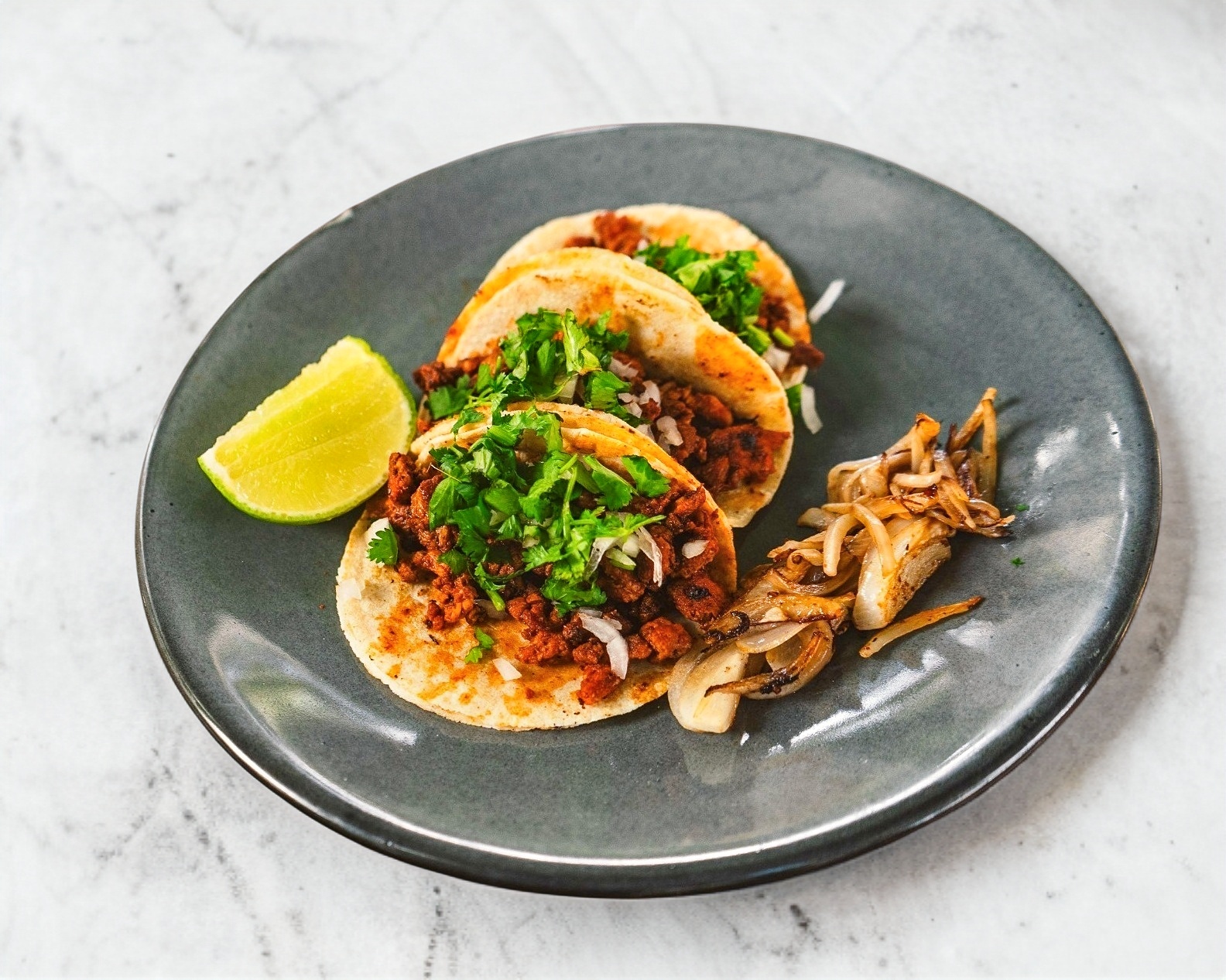 3 Tacos blandos con carne de costilla enchilada, cebolla caramelizada, cilantro y limón