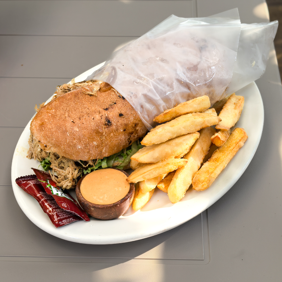 Mayonesa, lechuga, aguacate, cebolla caramelizada, papas paja, pierna de cerdo