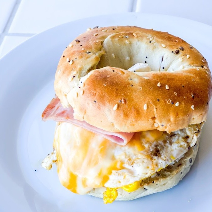bagel sencillo huevo { estrellado o revuelto}jamon de pavo y queso a escojer