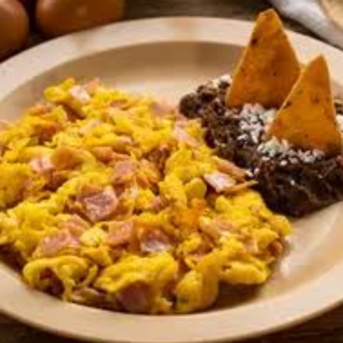 3 huevos con jamon frijoles 3 tortillas salsa aparte
