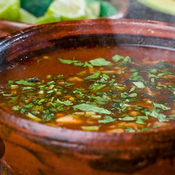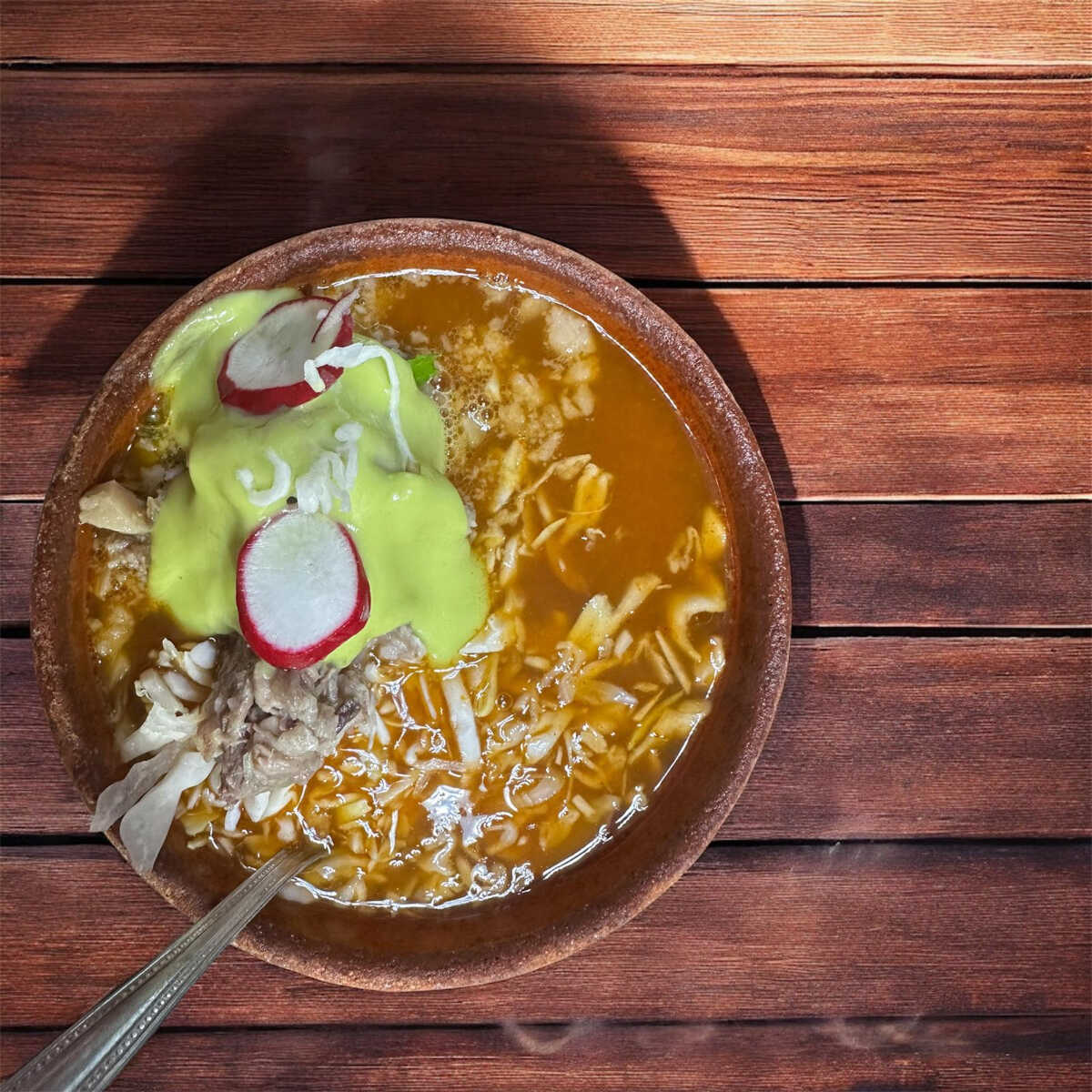 Medio litro aproximadamente de pozole rojo con maciza de res, acompañado con repollo, guacamole, tostadas y salsa (perrona).