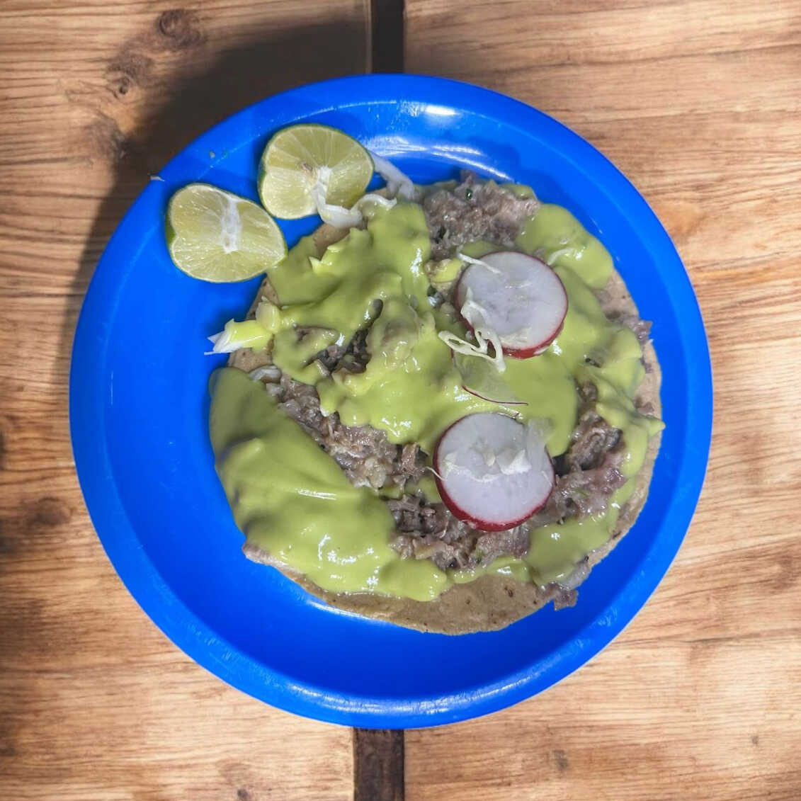 Tostada de maciza de res, acompañado con repollo, guacamole y salsa (perrona).