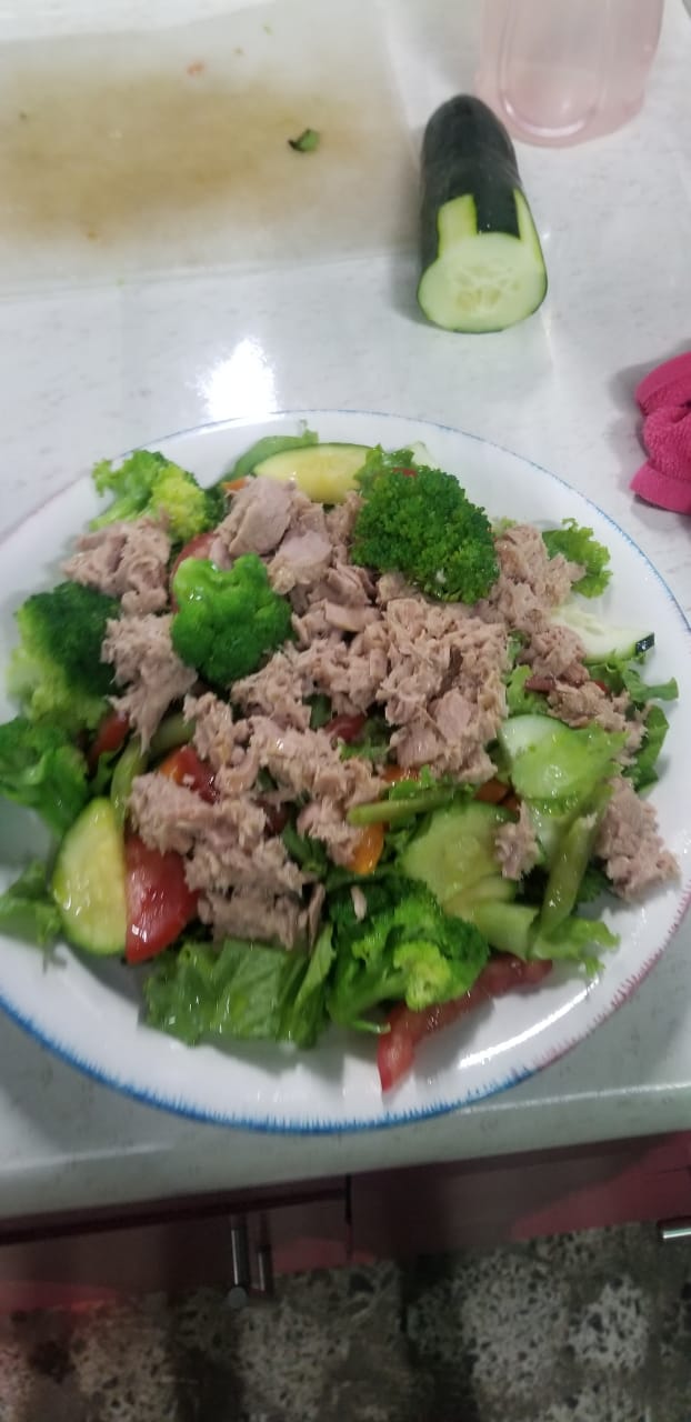 Lechuga, atún, tomate, pepino, apio, cebolla morada y aguacate.
