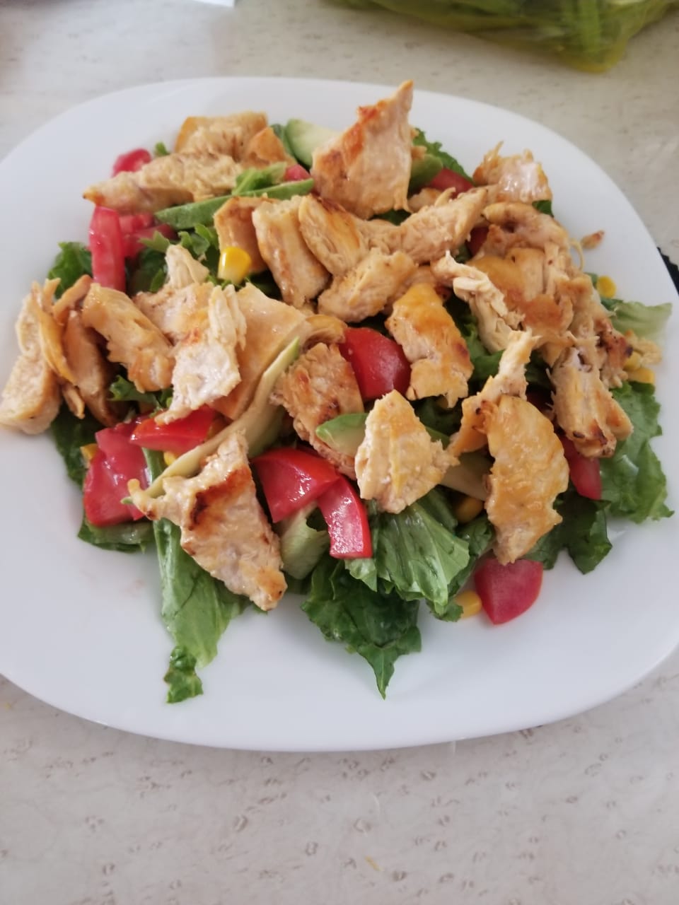 Pechuga de pollo, lechuga, tomate, pimiento rojo, aguacate y granos de elote.
