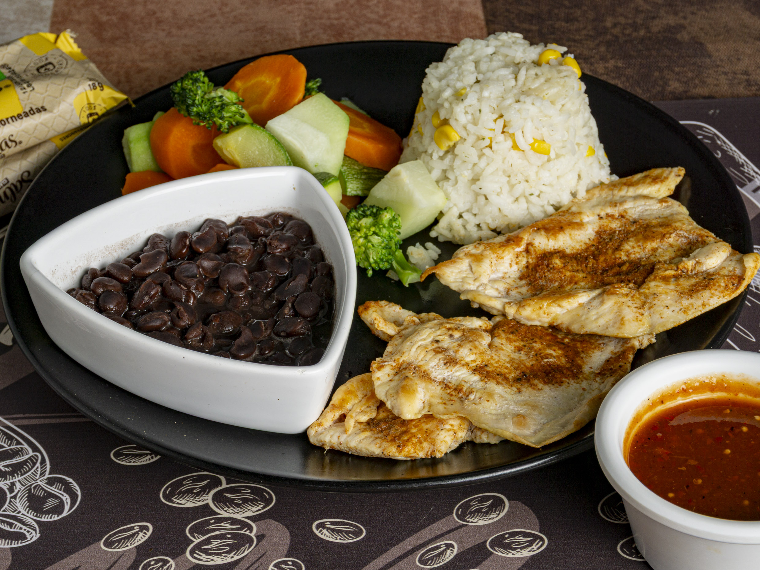 Pechuga de pollo a la plancha con arroz y verduras o ensalada.