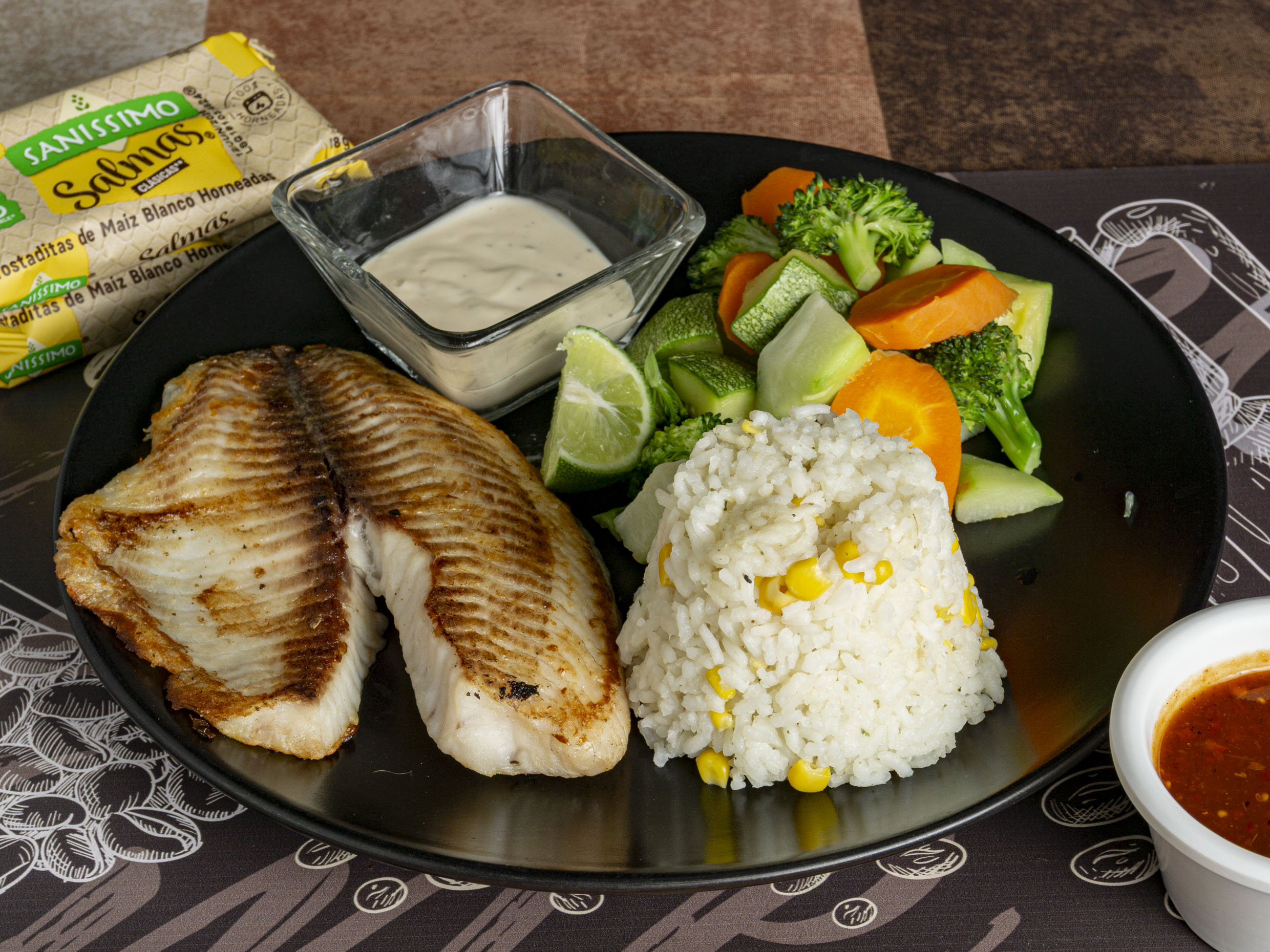 Filete de pescado a la plancha con arroz y verduras o ensalada.