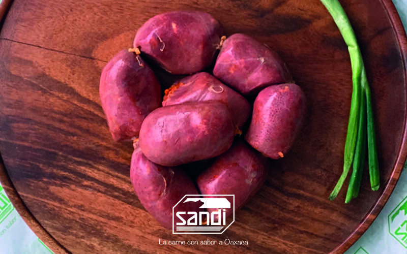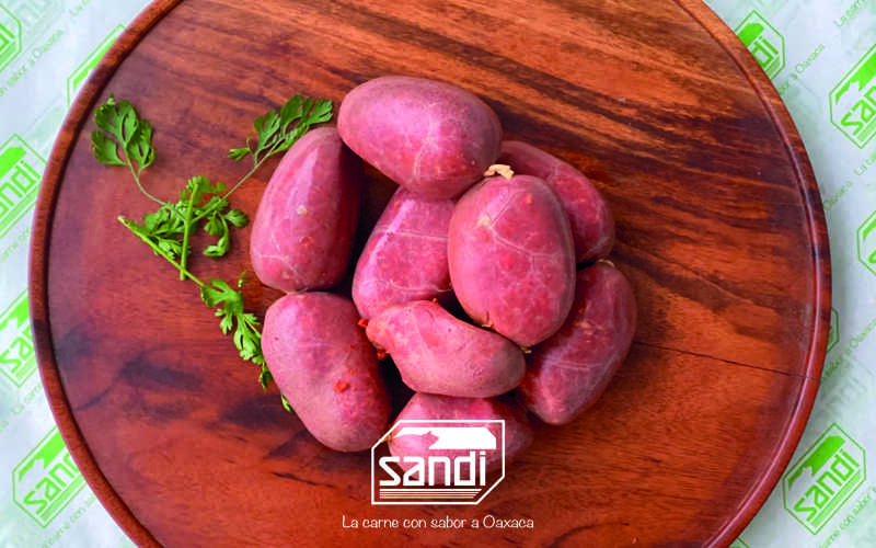 Molida de carne de cerdo, especias y chile guajillo embutida en tripa natural de cerdo (500 g).