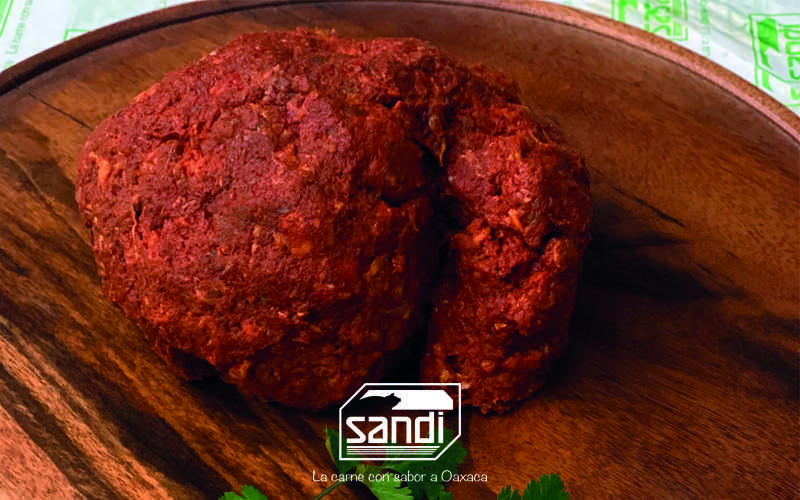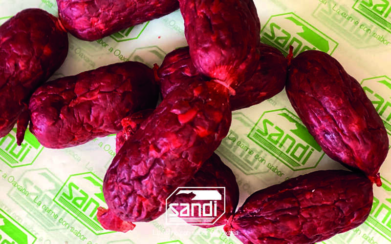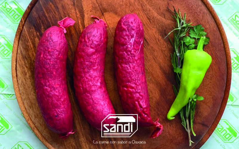 Molida de carne de res, especias y chile guajillo embutida en tripa natural de cerdo (500 g).