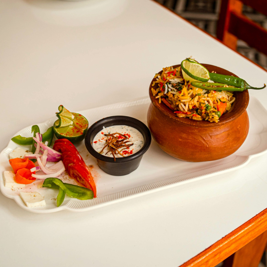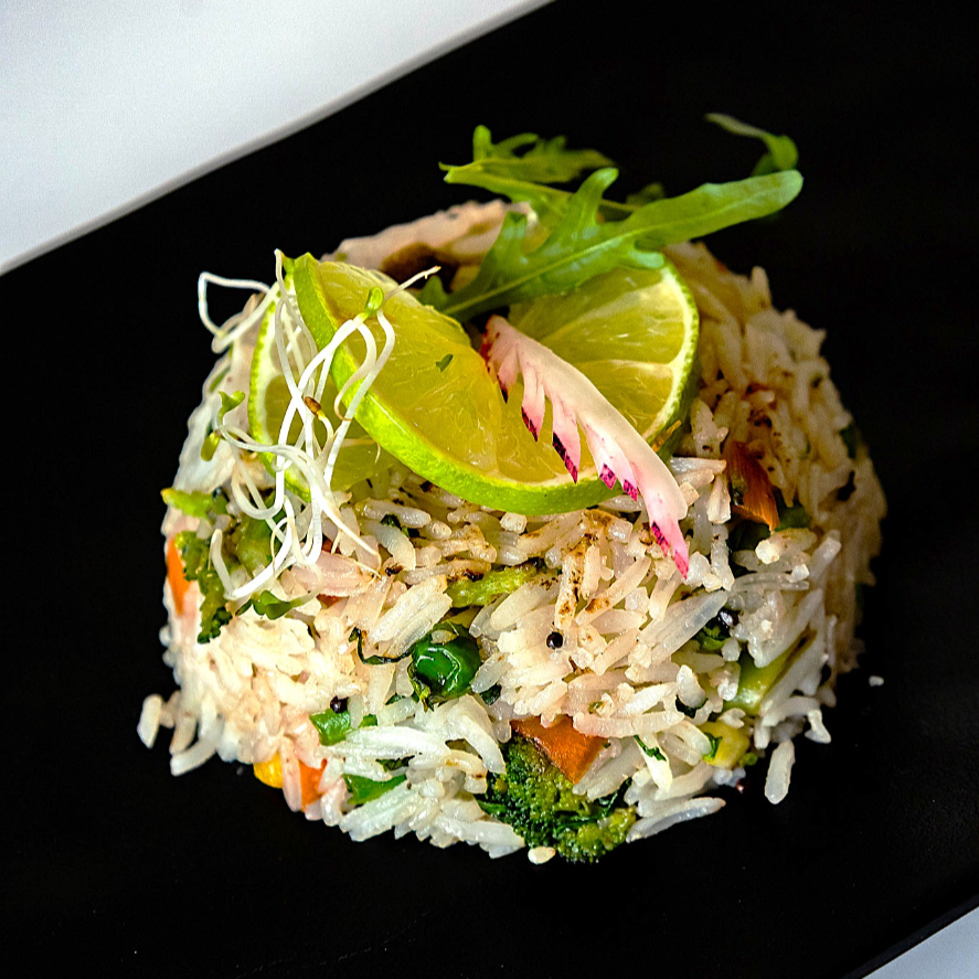 El biryani de verduras presenta una rica mezcla de especias aromáticas como comino, cilantro y canela, complementadas con cebollas caramelizadas, ajo y yogur tangy. arroz infusionado con azafrán, frutos secos y hierbas añaden capas de sabor, creando una fragante y sabrosa delicadeza del india.