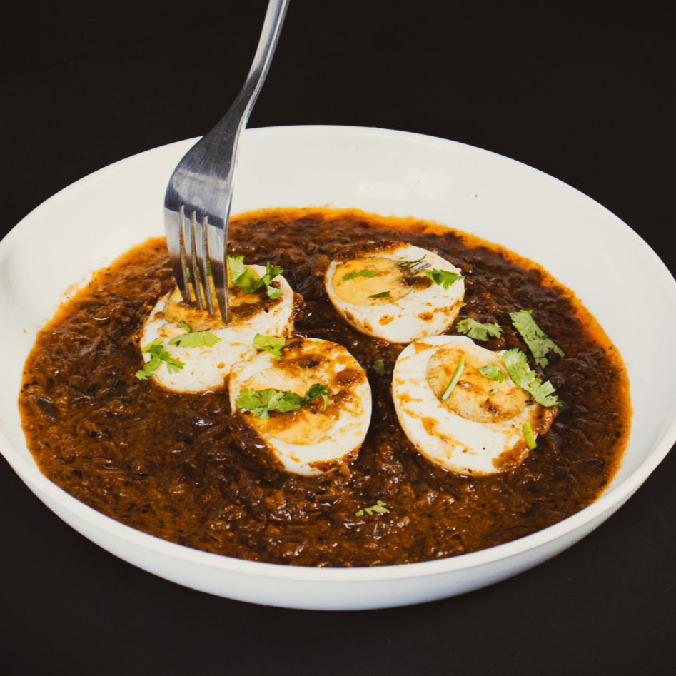 Incluye plato fuerte, Arroz Basmati y un Paan Naan (Classico o Ajo). Huevo, cebolla, especias de india, ajo, gengibre. (No tiene pollo)