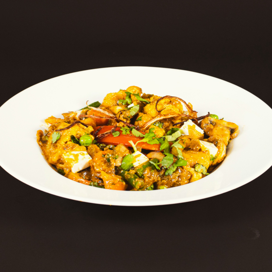 Incluye plato fuerte, Arroz Jasmin y un Paan Naan (Classico o Ajo). Papa, Queso, cauliflor, ejotes, chícharos, zanahoria, cebolla, tomate, especias de india, ajo, gengibre.