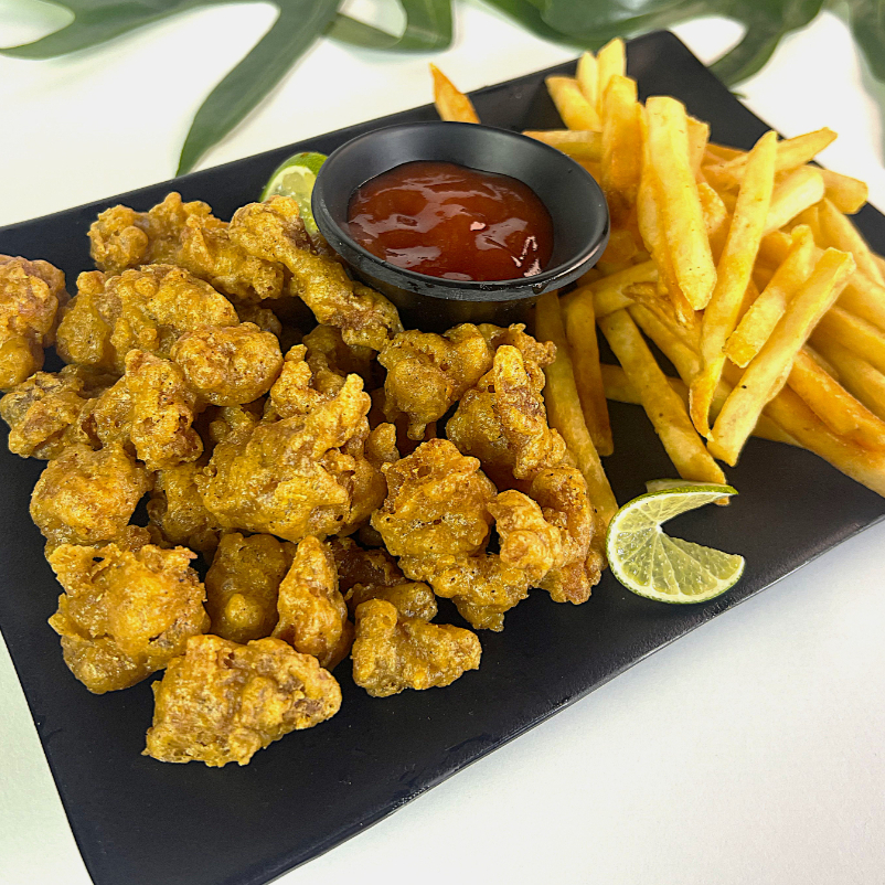 Bocaditos de pollo frito crujiente, dorados y jugosos. / Bite-sized crispy fried chicken nuggets, golden & juicy.