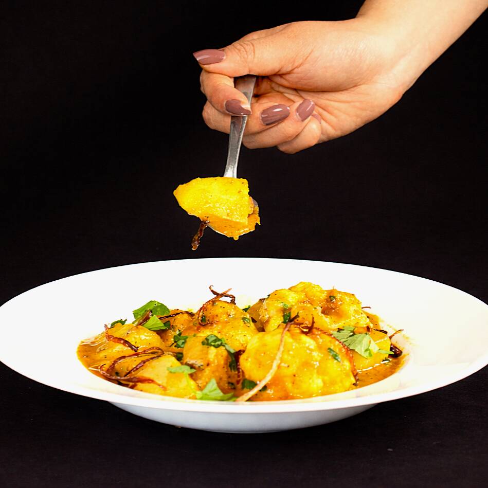 Incluye plato fuerte, Arroz Jasmin y un Paan Naan (Classico o Ajo). Papa, cauliflor, cebolla, tomate, especias de india, ajo, gengibre, culantro.