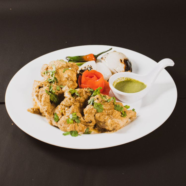 Pollo cremoso marinado en nata, ajo y especias suaves, asado tierno. / Creamy cashew-yogurt marinated chicken, mildly spiced & tender