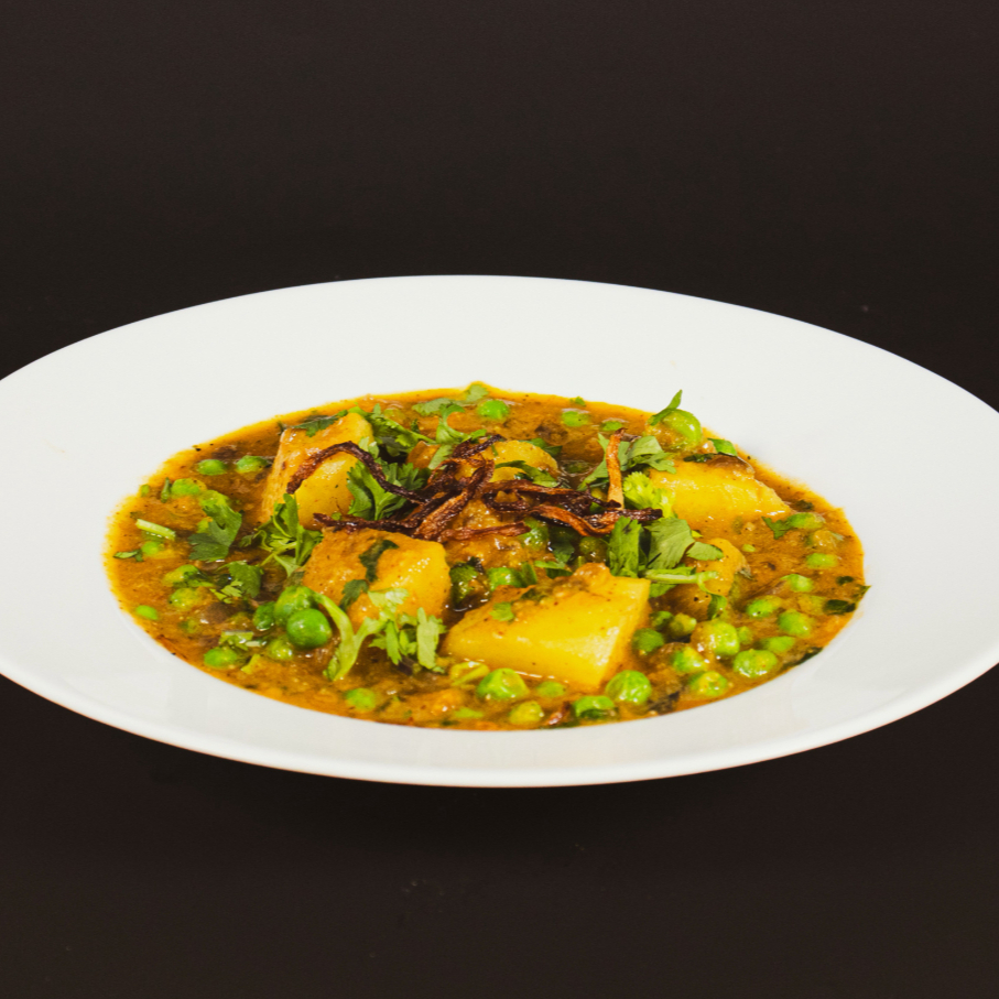Incluye plato fuerte, Arroz Jasmin y un Paan Naan (Classico o Ajo). Papa , chícharos, cebolla, tomate, especias de india, ajo, gengibre.