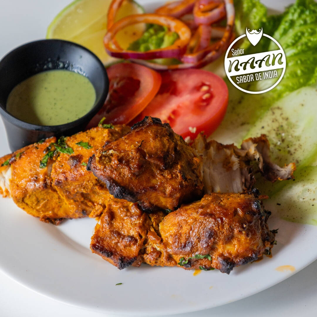Pollo marinado en yogur y especiado, asado en tandoor jugoso y ahumado / Yogurt-marinated chicken roasted in tandoor, juicy and smoky