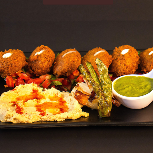 Bolitas crujientes de garbanzos con hierbas y especias, con tahini / Crispy chickpea fritters, herbs & spices, served with tahini.