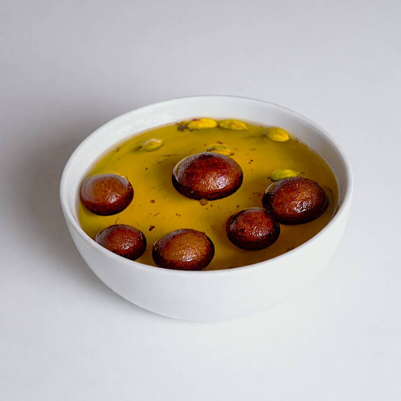 Bolitas de leche frita suaves remojadas en jarabe de azúcar con rosa.