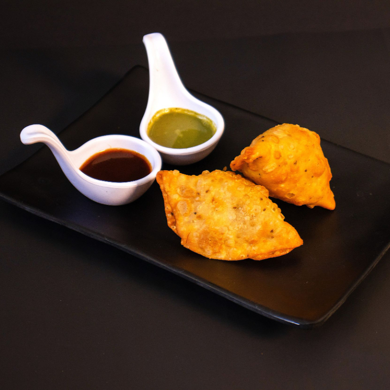 Triángulos hojaldrados rellenos de patata especiada y guisantes 2 pz. / Flaky pastry triangles stuffed with spiced potatoes & peas.