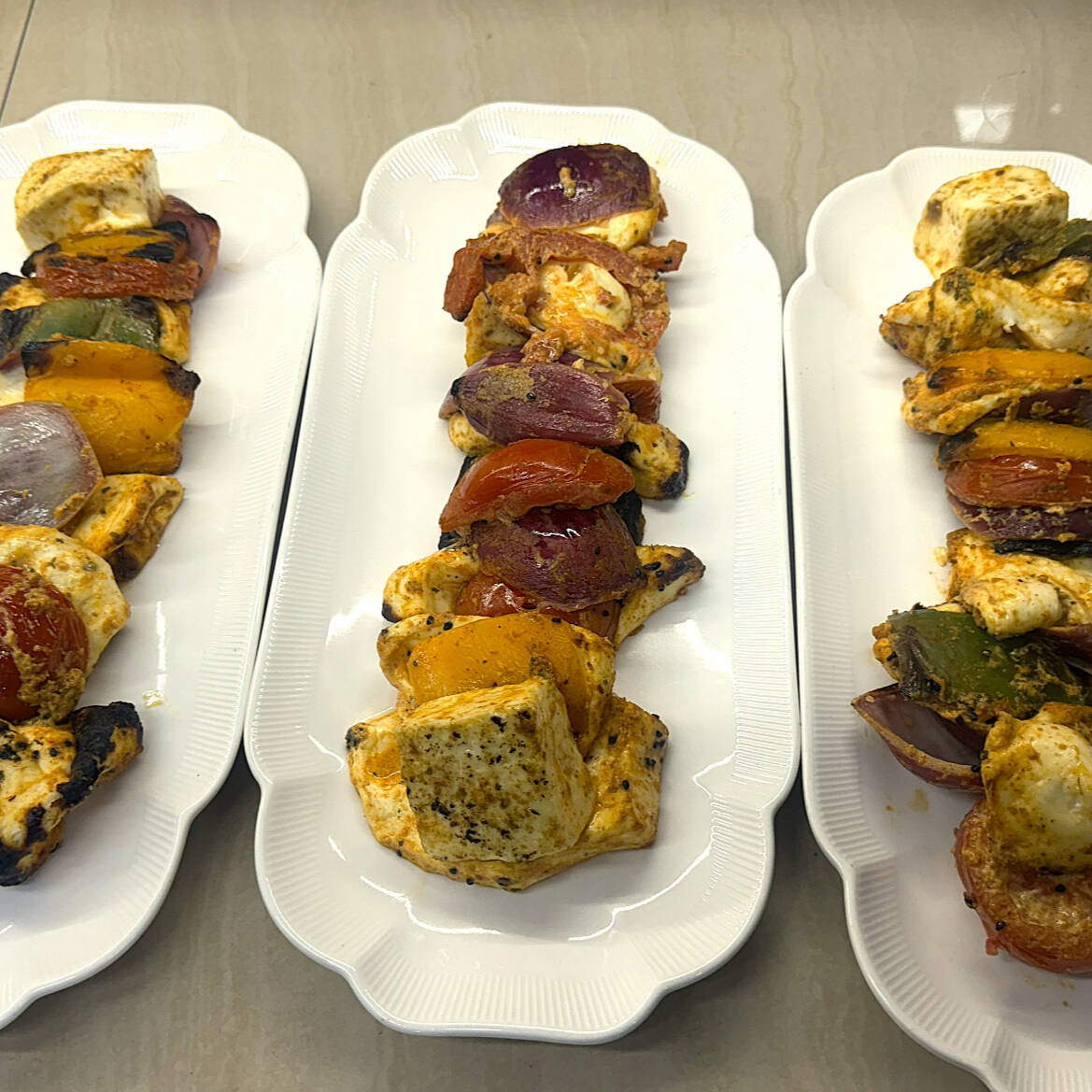 Cubos de paneer (trozos de queso) marinados en especias de la india y asados a parilla, acompanados con ensalada y cebolla cambray. / Paneer cubes in yogurt-spice marinade, tandoor-smoky