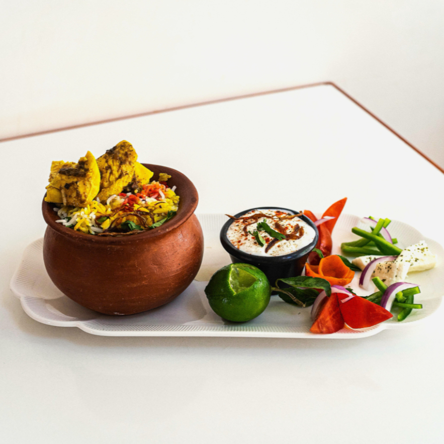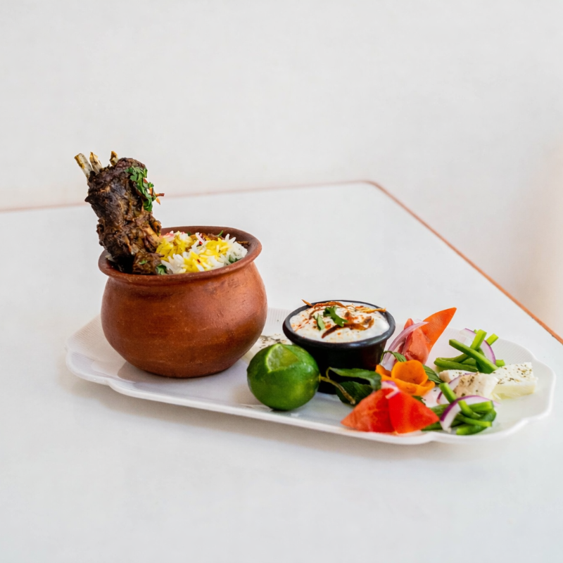 El biryani de chivo (goat) presenta una rica mezcla de especias aromáticas como comino, cilantro y canela, complementadas con cebollas caramelizadas, ajo y yogur tangy. arroz infusionado con azafrán, frutos secos y hierbas añaden capas de sabor, creando una fragante y sabrosa delicadeza del india.