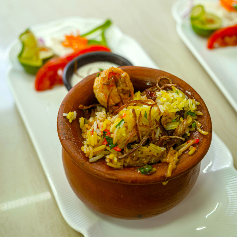 El biryani de camaron (shrimp) presenta una rica mezcla de especias aromáticas como comino, cilantro y canela, complementadas con cebollas caramelizadas, ajo y yogur tangy. arroz infusionado con azafrán, frutos secos y hierbas añaden capas de sabor, creando una fragante y sabrosa delicadeza del india.
