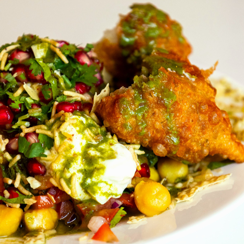 Samosas trituradas con yogur, chutneys, cebolla, garbansos y especias. / Crushed samosas topped with yogurt, chutneys, sev and spices.