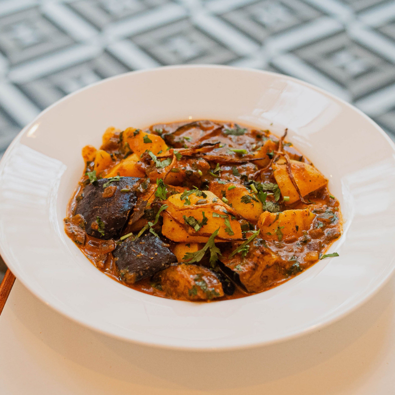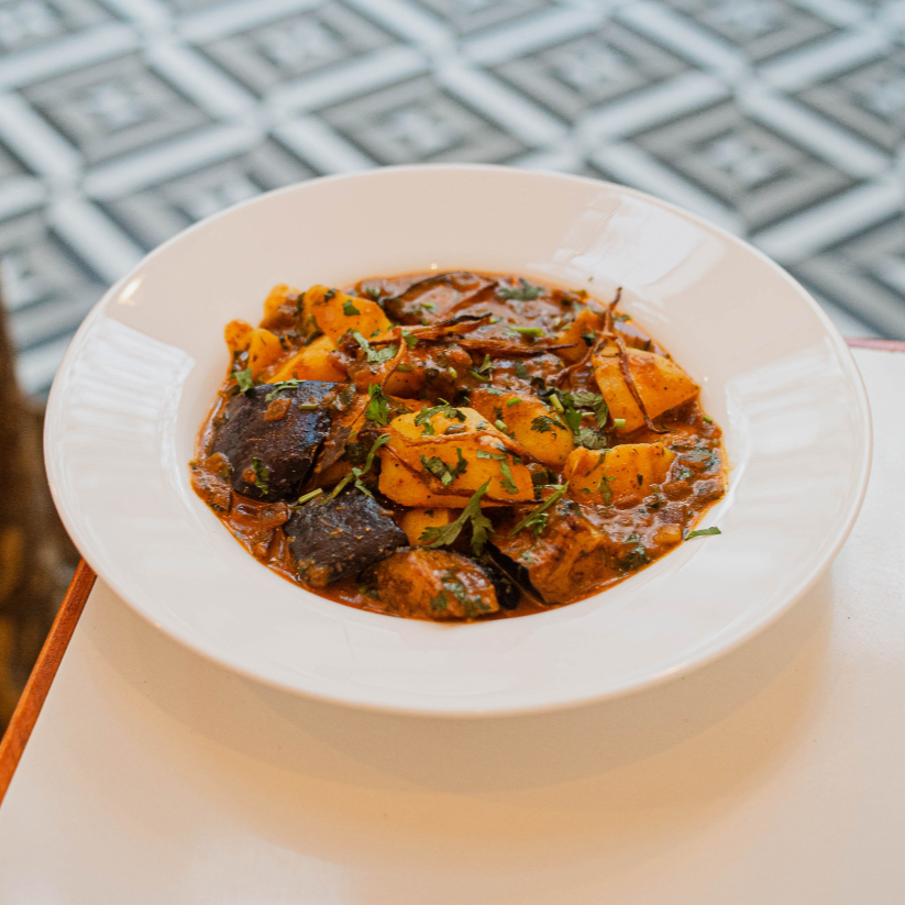 Incluye plato fuerte, Arroz Basmati y un Paan Naan (Classico o Ajo). Rogan Josh es un curry tradicional de Cachemira conocido por su salsa rica, aromática y llena de sabor. Generalmente se prepara con tiernos trozos de cordero o cabra y se caracteriza por una mezcla de especias como cúrcuma, comino, cilantro, cardamomo y clavos. El plato a menudo incluye yogur para darle cremosidad y azafrán para