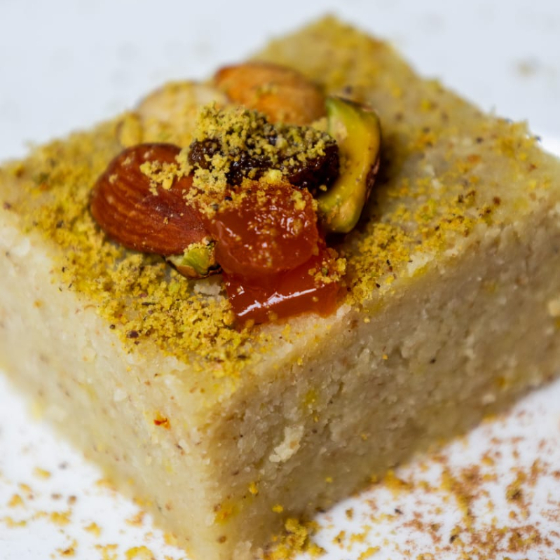 Postre de la India de sémola cocida lentamente en ghee, azúcar, cardamomo y nueces.