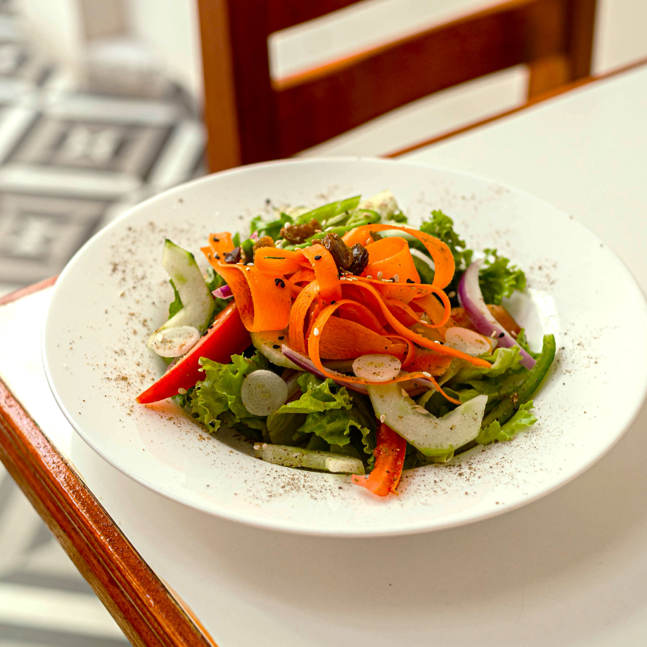 Una ensalada verde consiste en lechuga fresca y crujiente o verduras mixtas combinadas con una variedad de verduras como pepinos, tomates y pimientos morrones. se adereza con aderezo y ofrece una guarnición refrescante y nutritiva o una comida ligera.