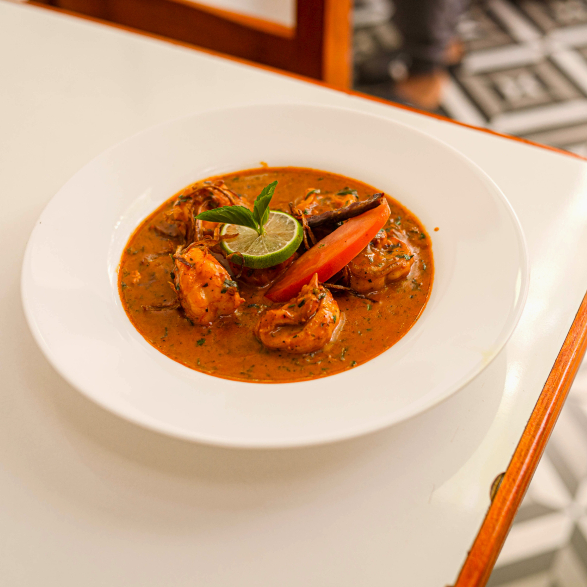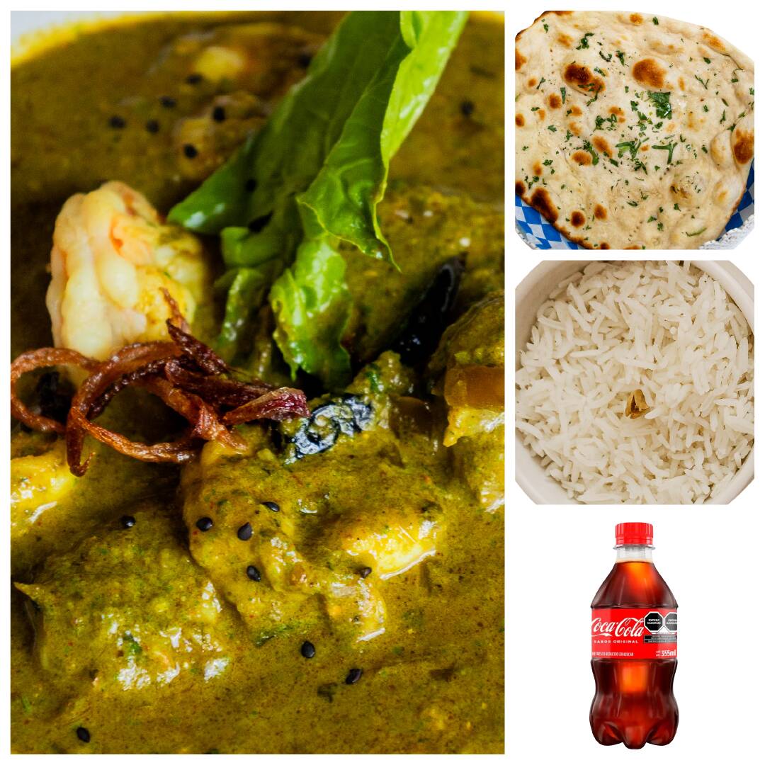Incluye plato fuerte, Arroz Basmati y un Paan Naan (Classico o Ajo). Plato de camarones cocidos en una rica salsa de tomate y especias indias, combinando cebolla, ajo, jengibre, comino, cúrcuma, y cilantro.