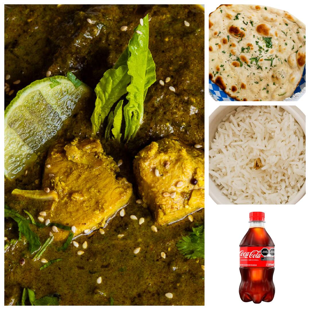Incluye plato fuerte, Arroz Jasmin y un Paan Naan (Classico o Ajo). Espinaca, queso, crema, cebolla, tomate, especias de india, ajo, gengibre.