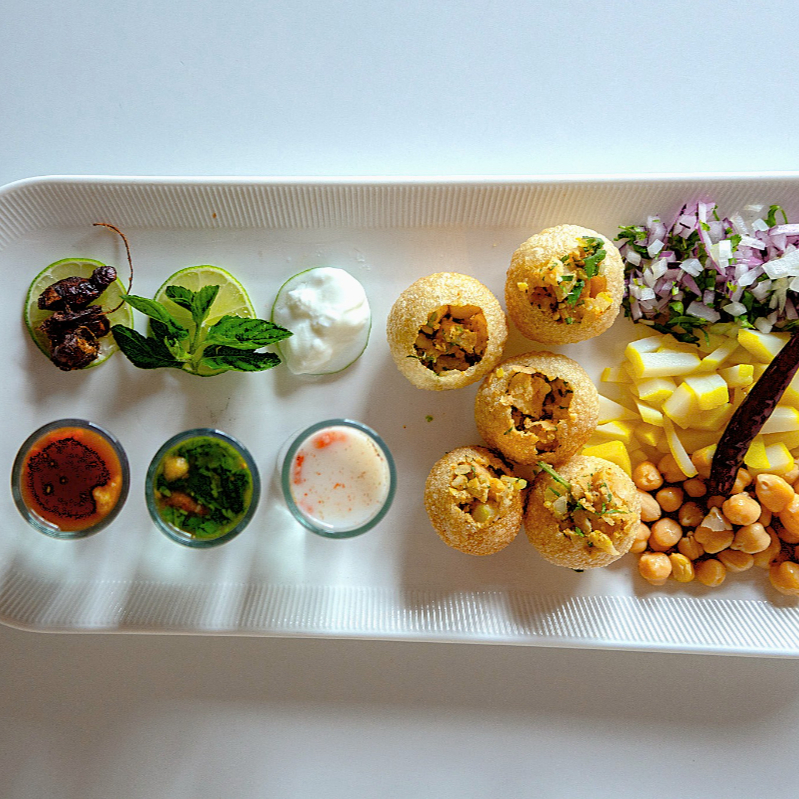 Puris crujientes rellenos de agua de tamarindo-menta, patata y garbanzos. / Hollow crispy puris filled with tamarid- mint water, potato & chickpeas