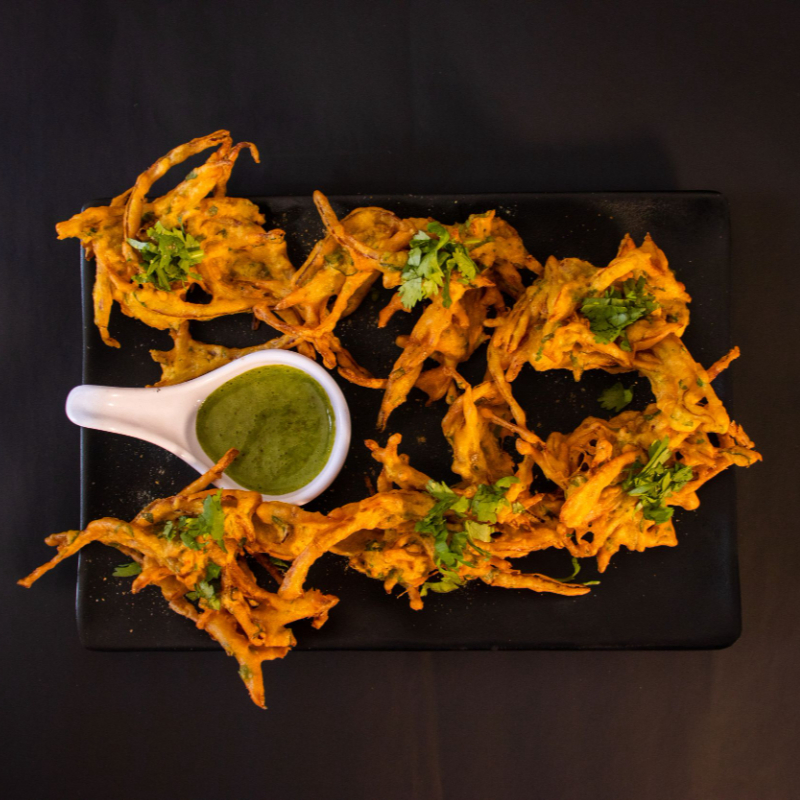 Buñuelos crujientes de cebolla en masa de garbanzos especiada / Crispy onion fritters in spiced chickpea batter.