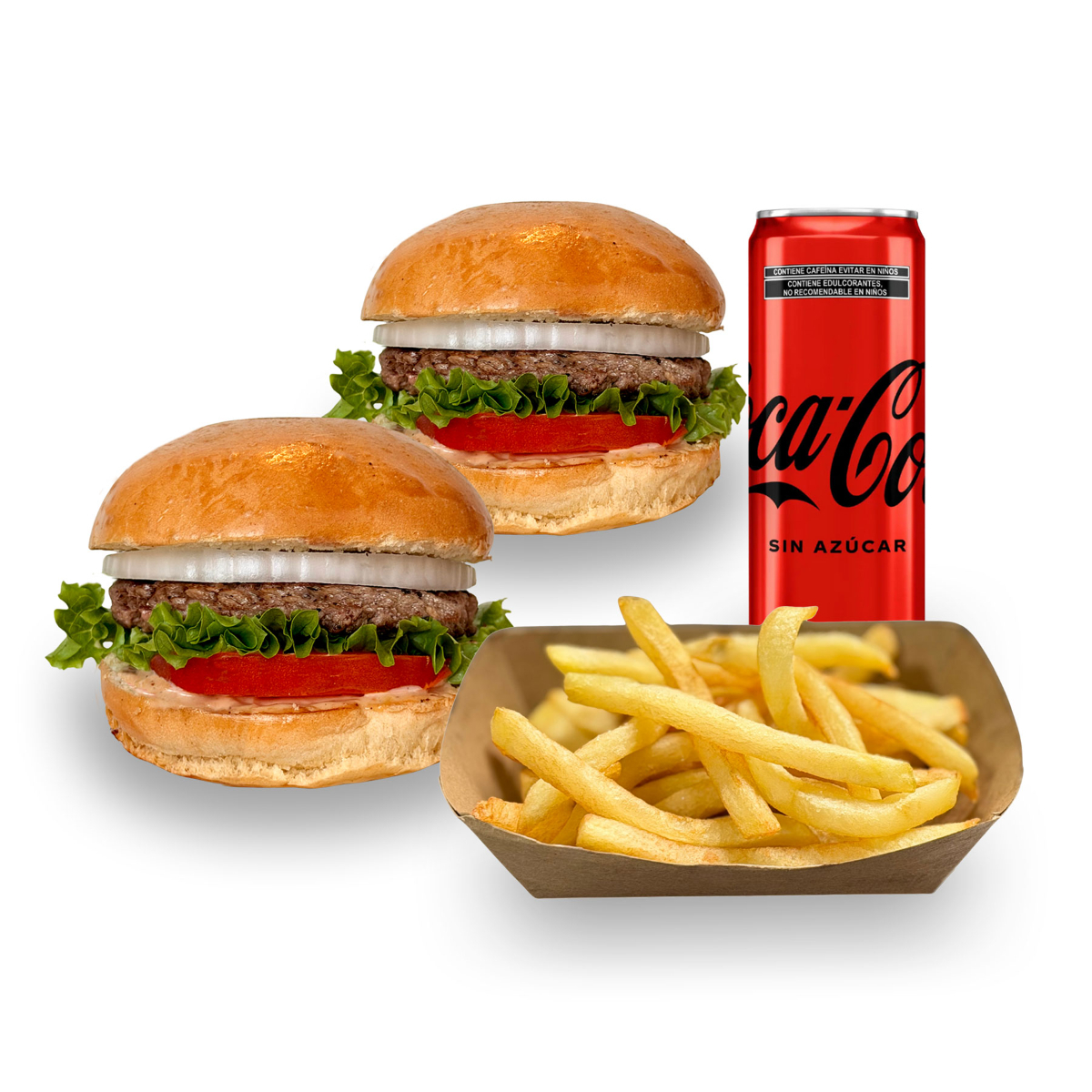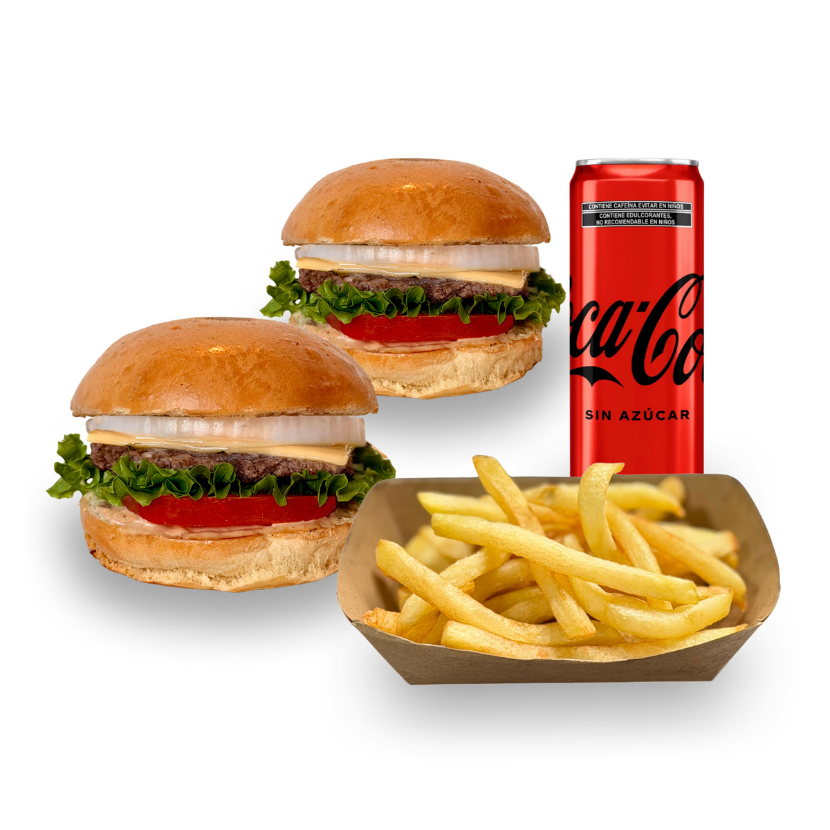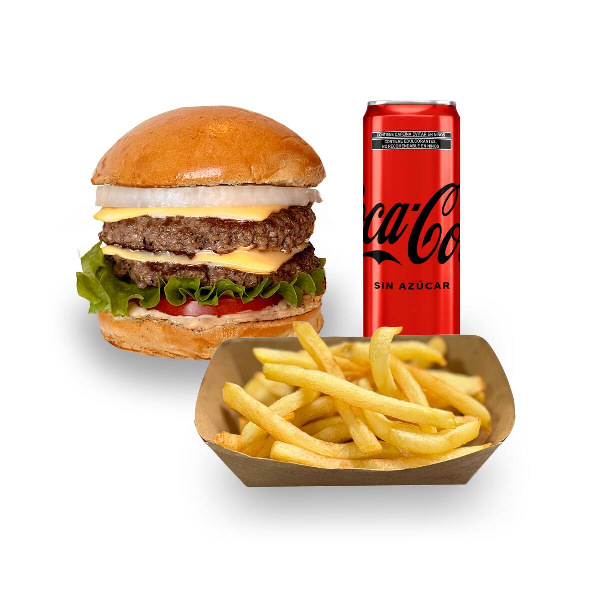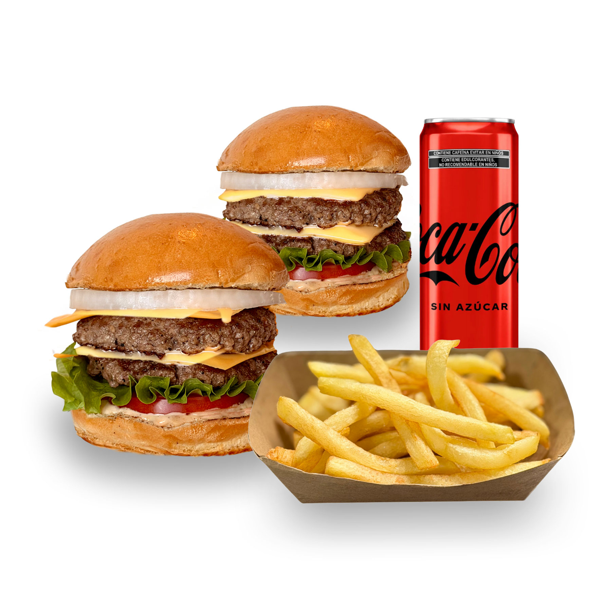 Cien porciento doble carne angus, doble queso americano, pan brioche,aderezo de la casa, jitomate, lechuga italiana, cebolla. papas russet, refresco.