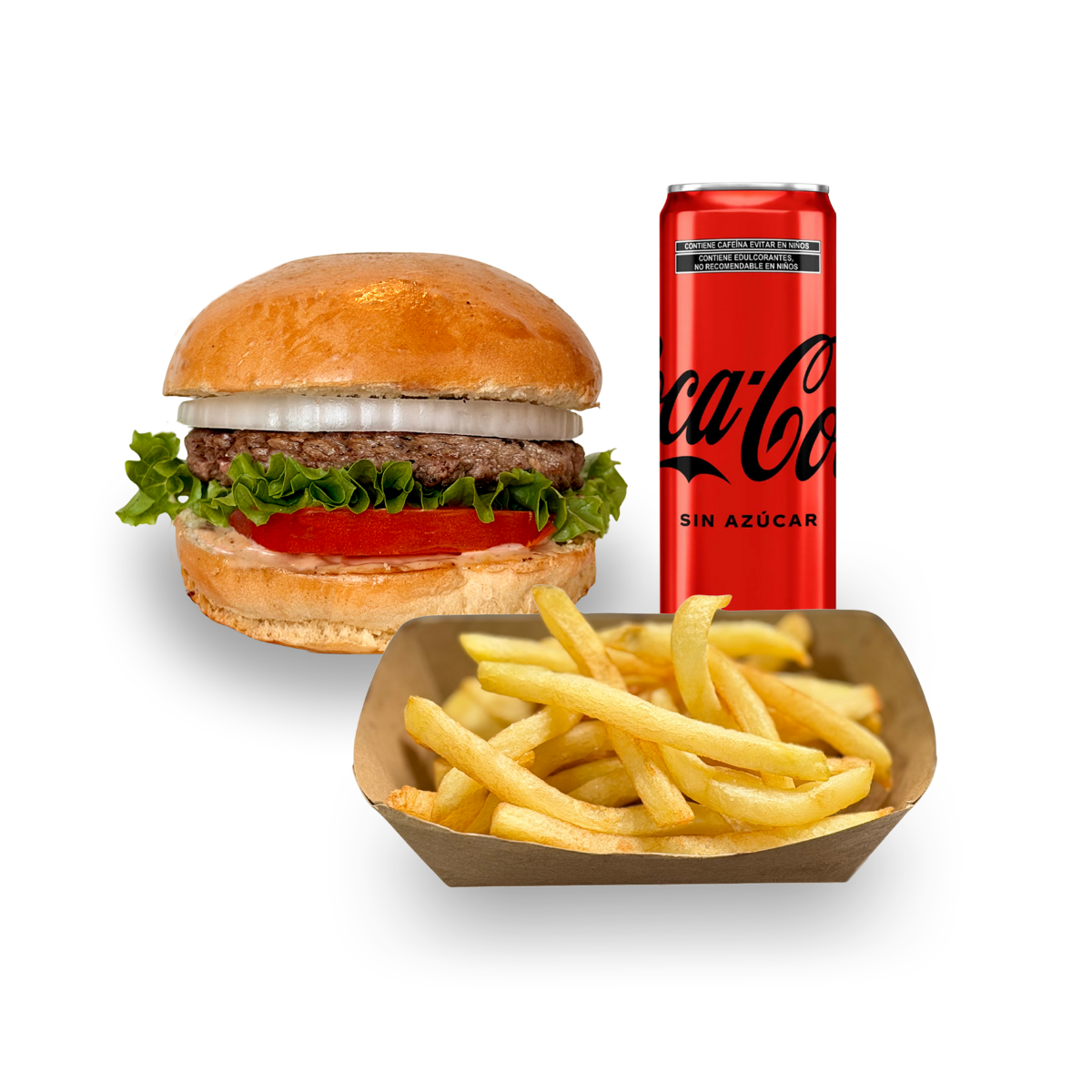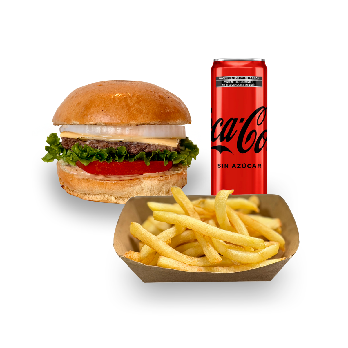 Cien porciento carne angus, queso americano, pan brioche, aderezo de la casa, jitomate, lechuga italiana, cebolla. papas russet, refresco.