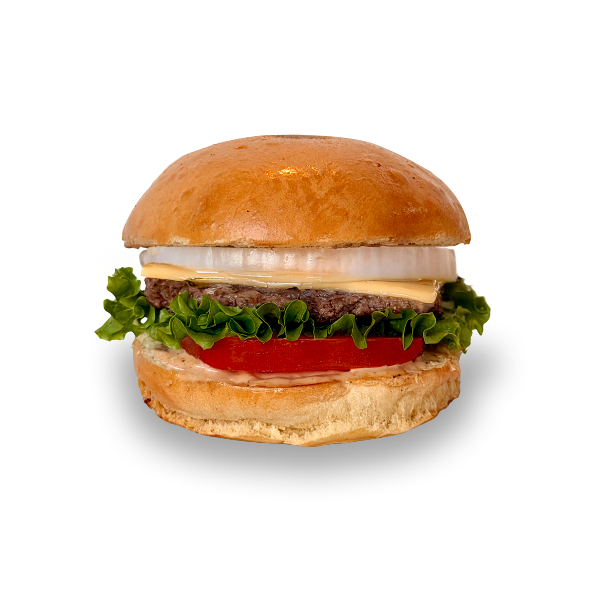 Cien porciento carne angus, queso americano, pan brioche, aderezo de la casa, lechuga italiana, cebolla.