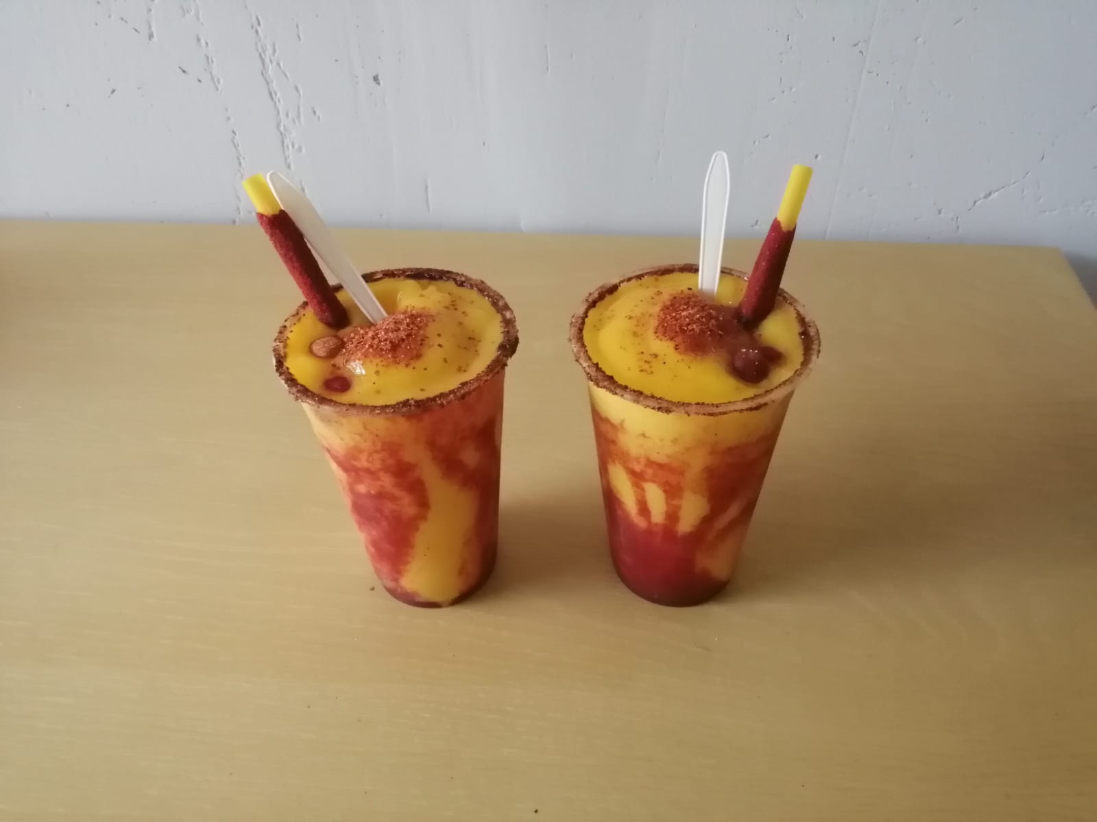 Frape de mango 16oz, escarchado con sal de chile de la casa,,acompañado de una banderilla de chile pica fresa.