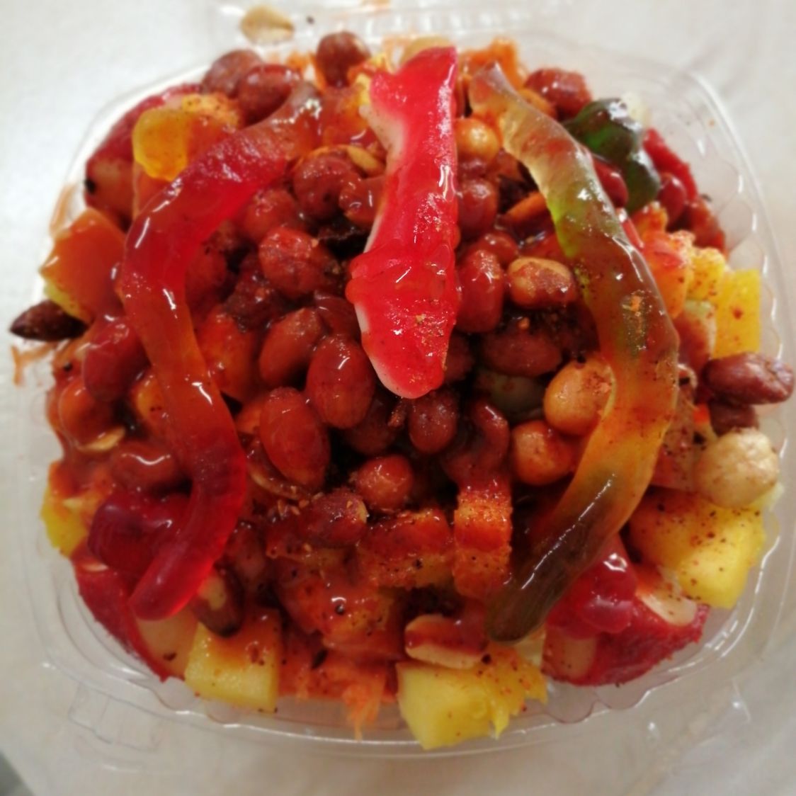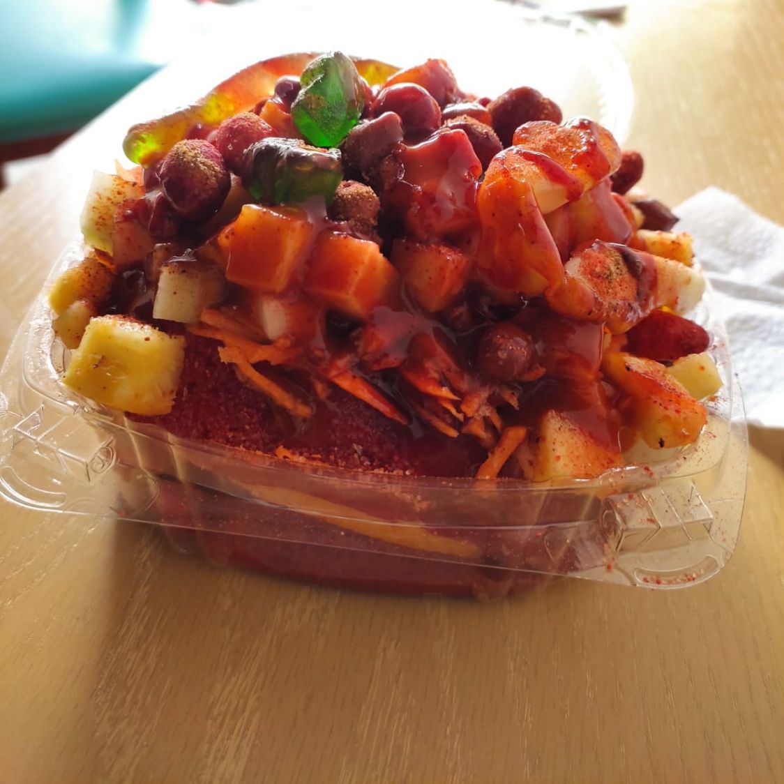 mango cubierto de forrito sabor chamoy,jicama,zanahoria,pepino,cacahuates,gomitas,chile,salsa,chamoy tajin