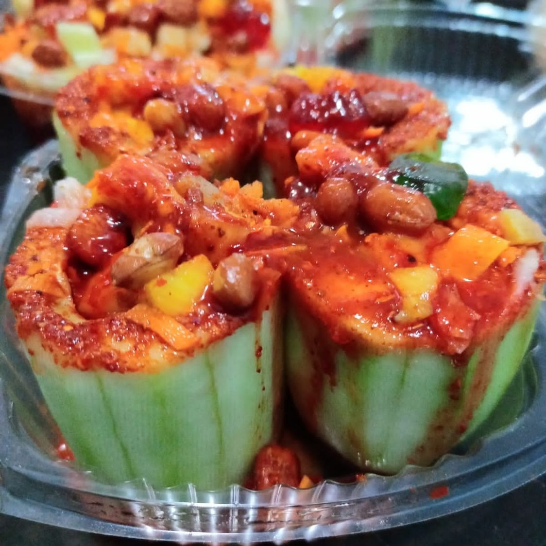 Pepinos escarchados con chile, rellenos de jícama, zanahoria y piña, acompañados de cacahuates y gomitas