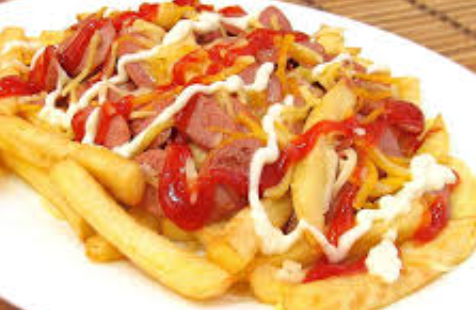 Papas fritas acompañadas de salchicha y tocino.
