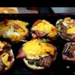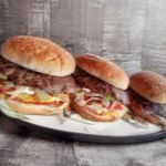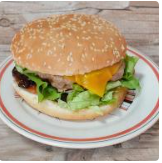 Carne, jamón, queso amarillo, tomate, lechuga, cebolla frita. Aderezos y picante.