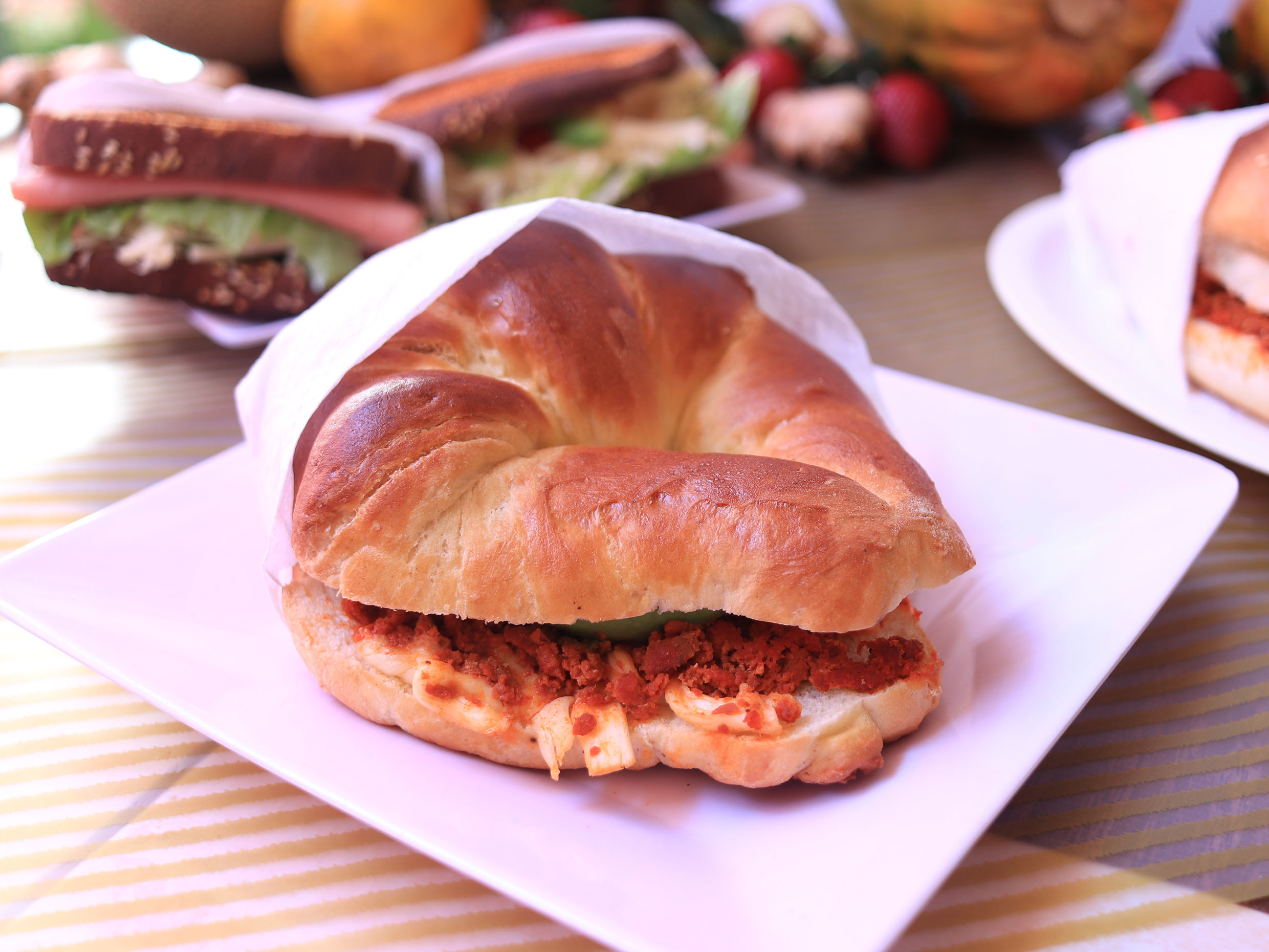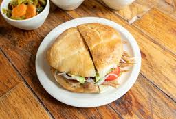 Pan baguette con quesillo, pollo deshebrado, aguacate, tomate, jalapeños, mayonesa.