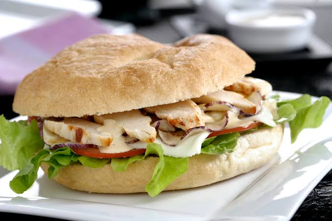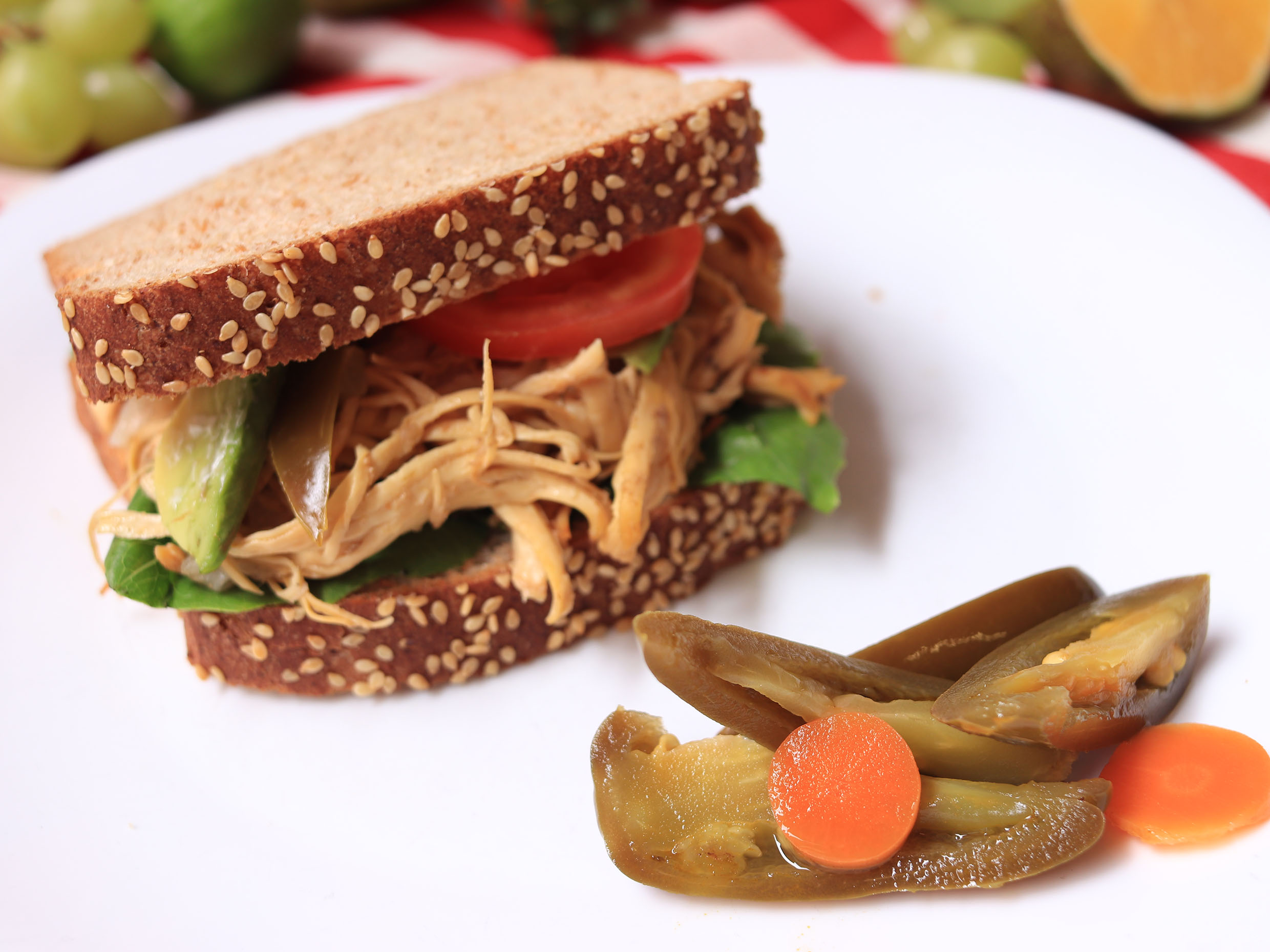 Pan integral con pollo deshebrado, mayonesa, aguacate, tomate, jalapeños.