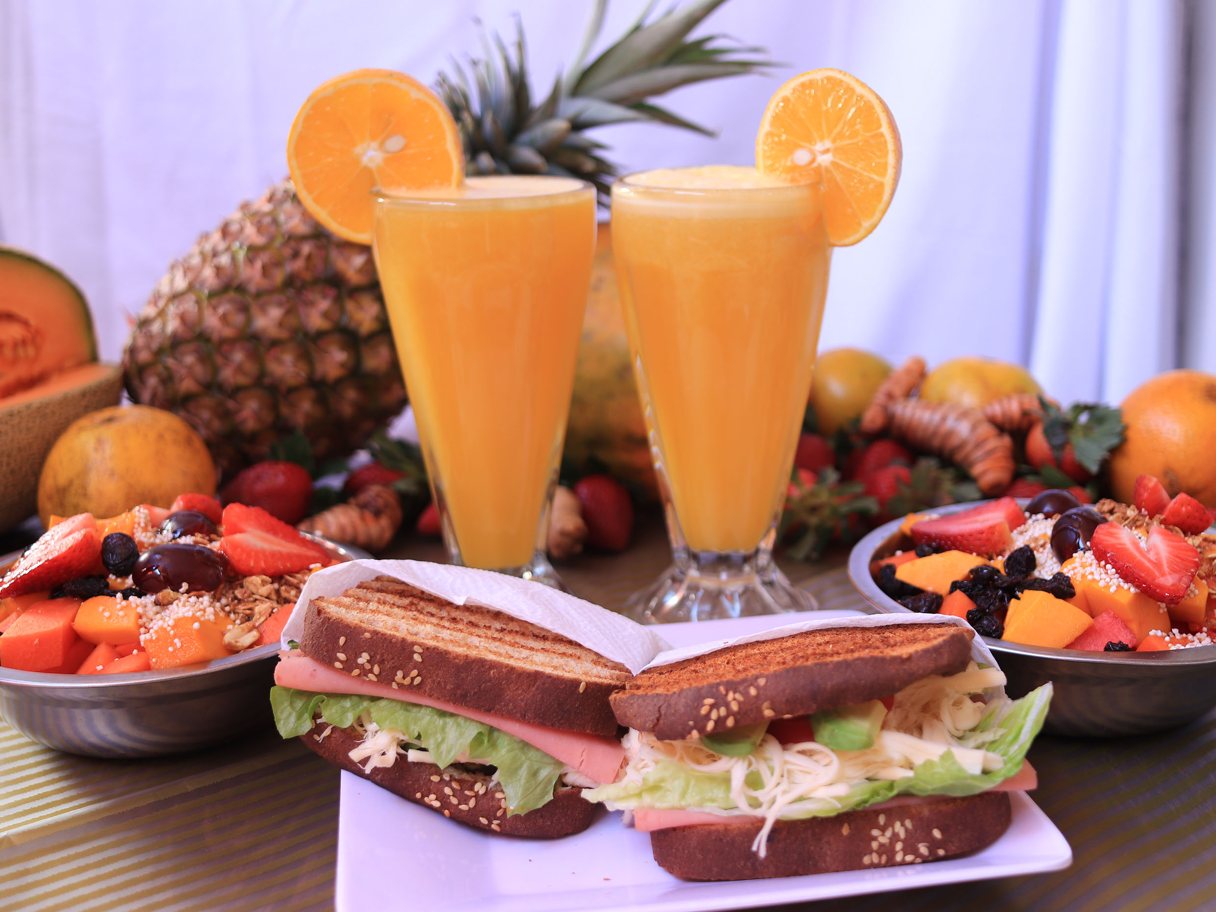 2 Sándwiches de jamón de pavo con quesillo, 2 jugos de naranja de 500 ml, 2 cócteles con miel y granola.