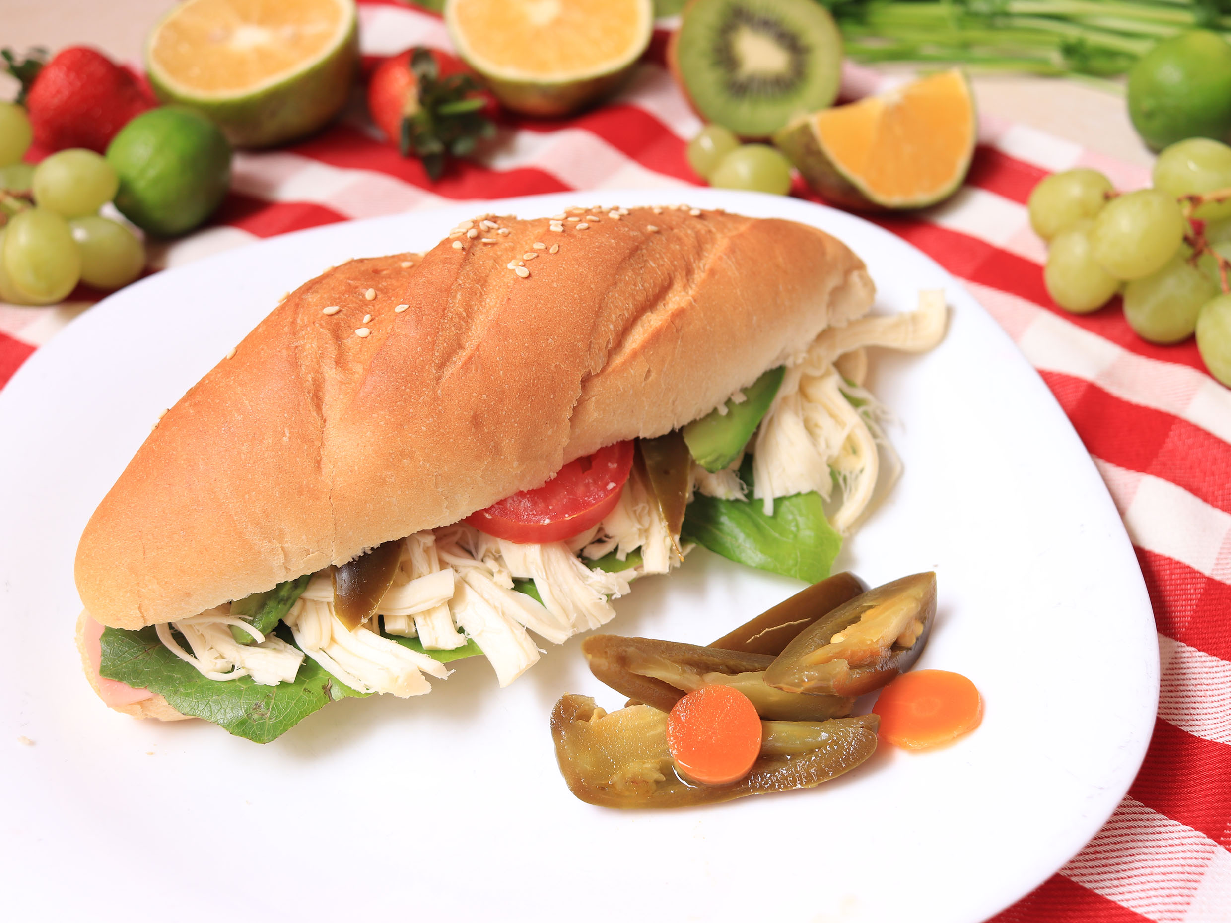 Pan baguette con pollo, aguacate, tomate, jalapeños, mayonesa.